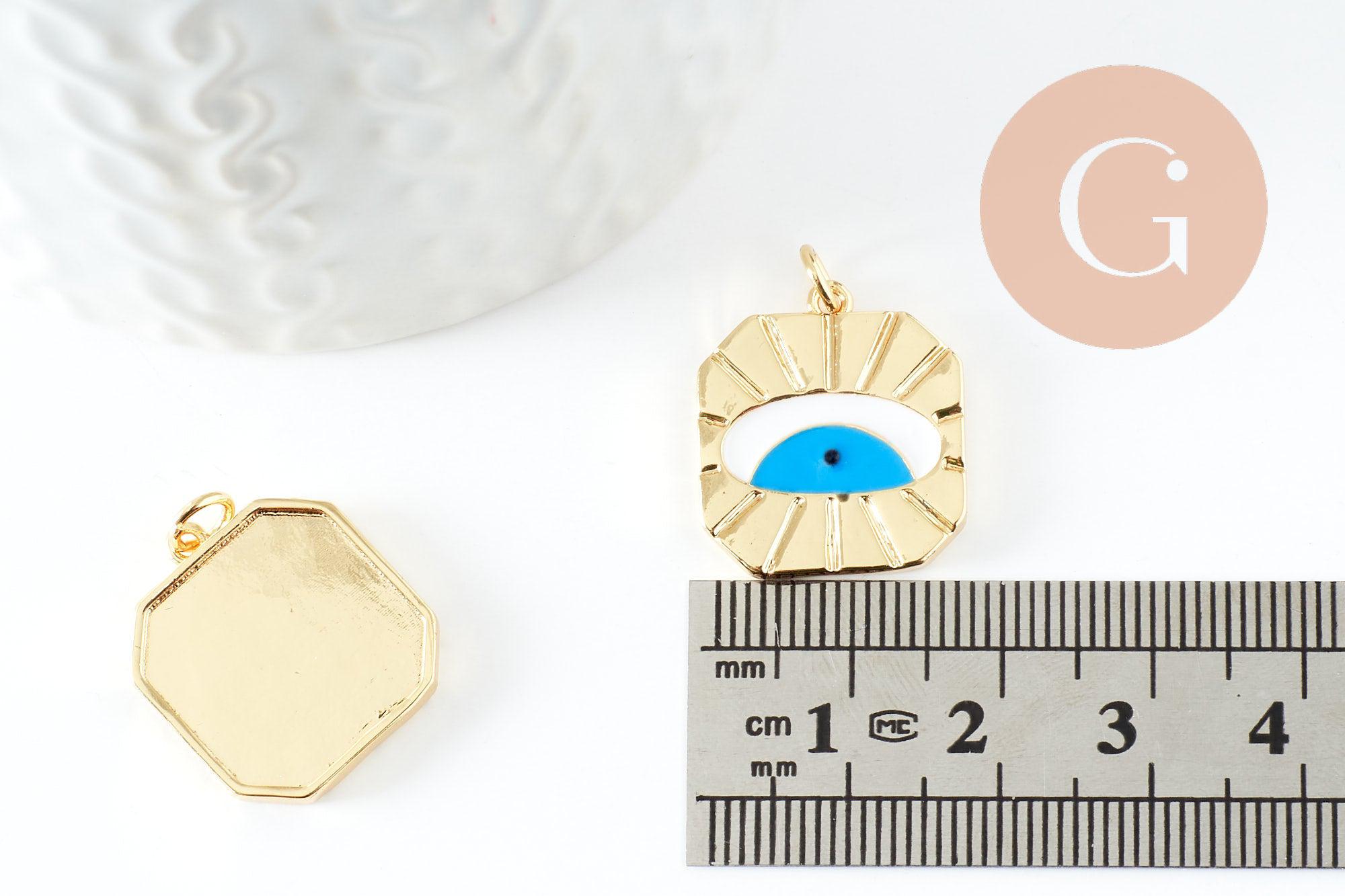 Colgante de medalla redonda con ojo de esmalte azul blanco, latón bañado en oro de 18 quilates y cristal de circonita, colgante de latón, creación de joyas, 20,6 mm, x1 (G3580)