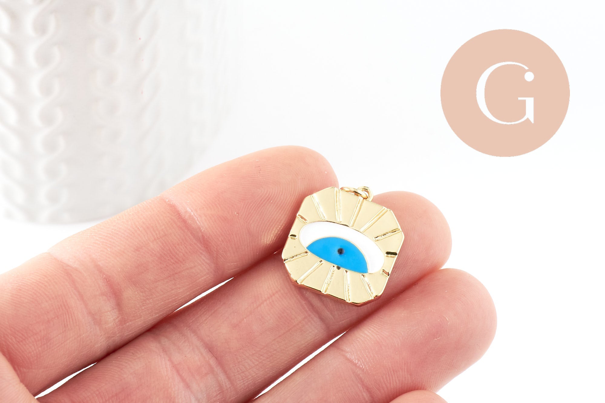 Una bonita medalla de ojo dorado con textura contra el mal de ojo, dorada y esmaltada con resina de colores.