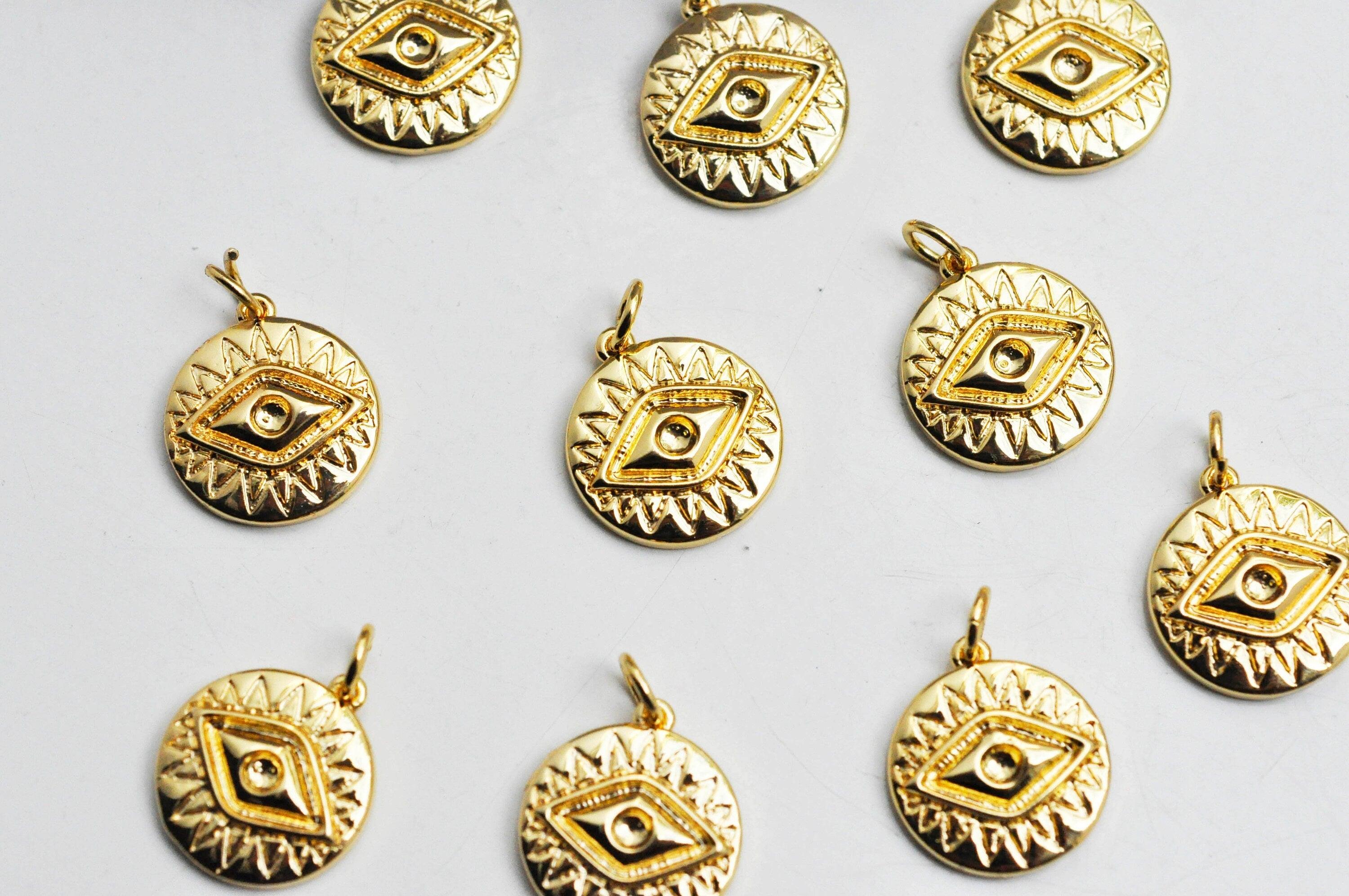 Pulsera inspiradora: personalice una pulsera con este colgante de medalla de ojo redondo para darle un toque de protección y estilo. Las bases de pulseras de oro son perfectas para este uso. Lleva un símbolo de suerte y benevolencia en tu muñeca.