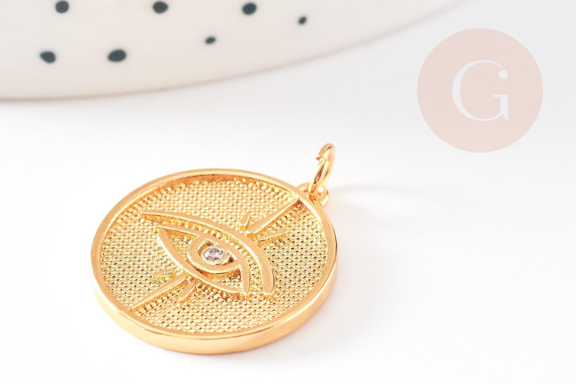 Colgante de medalla redonda con forma de ojo de latón texturizado bañado en oro de 18 quilates, colgante bañado en oro sin níquel para crear joyas con medallas de oro, 22 mm, unidad Una bonita medalla redonda de latón bañado...