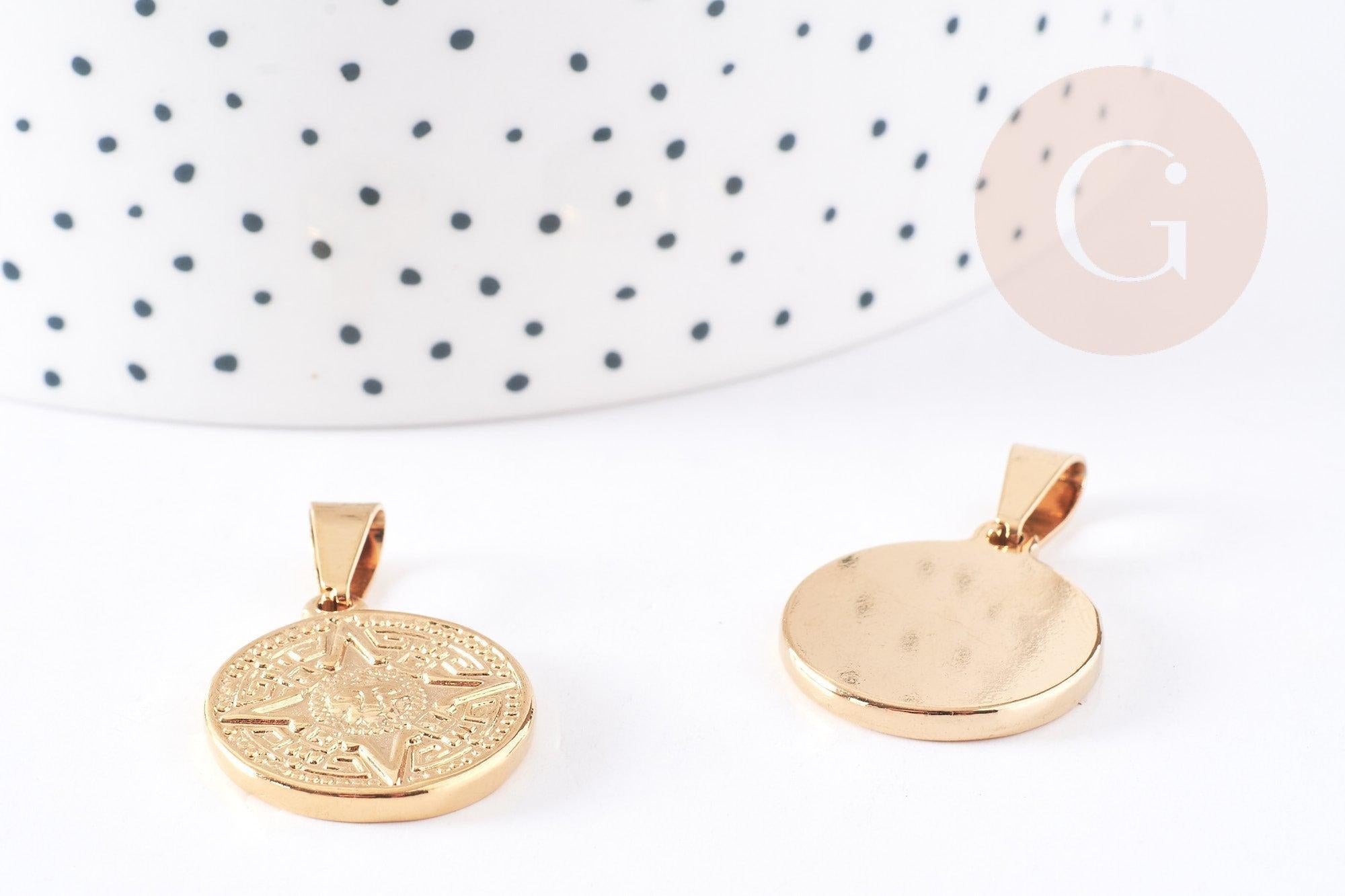 Colgante medallón redondo de rosa de los vientos, acero inoxidable 304, chapado en oro, 23,4 mm, colgante chapado en oro sin níquel, acero chapado en oro, creación de joyería, 1 unidad (G2637)