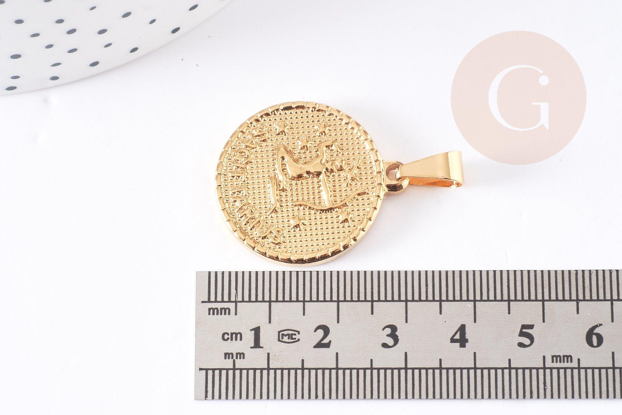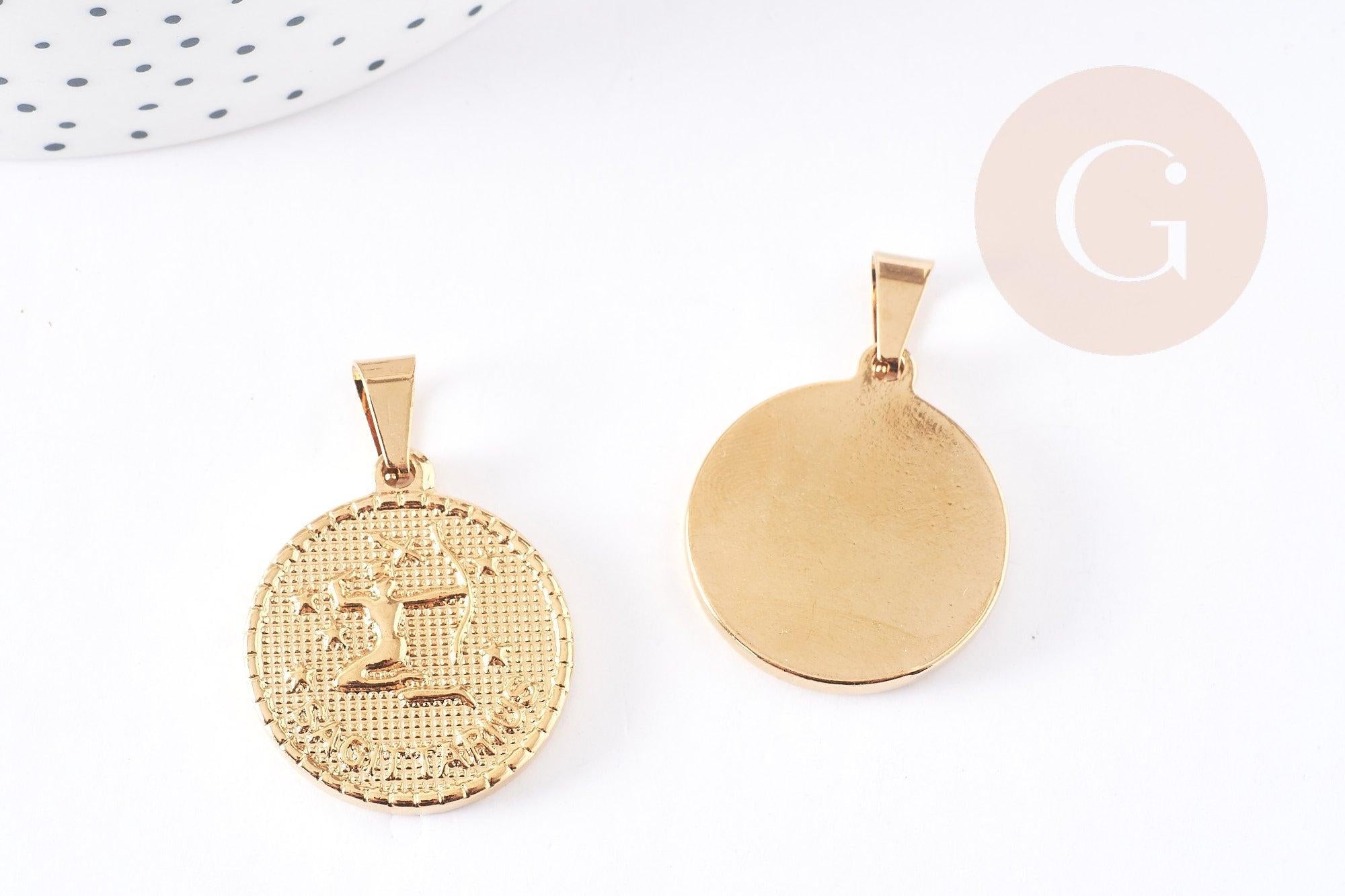 Medalla colgante redonda Sagitario en acero dorado, signo astrológico, colgante dorado, sin níquel, latón dorado, creación de joyas, medalla de oro, 2,9 cm