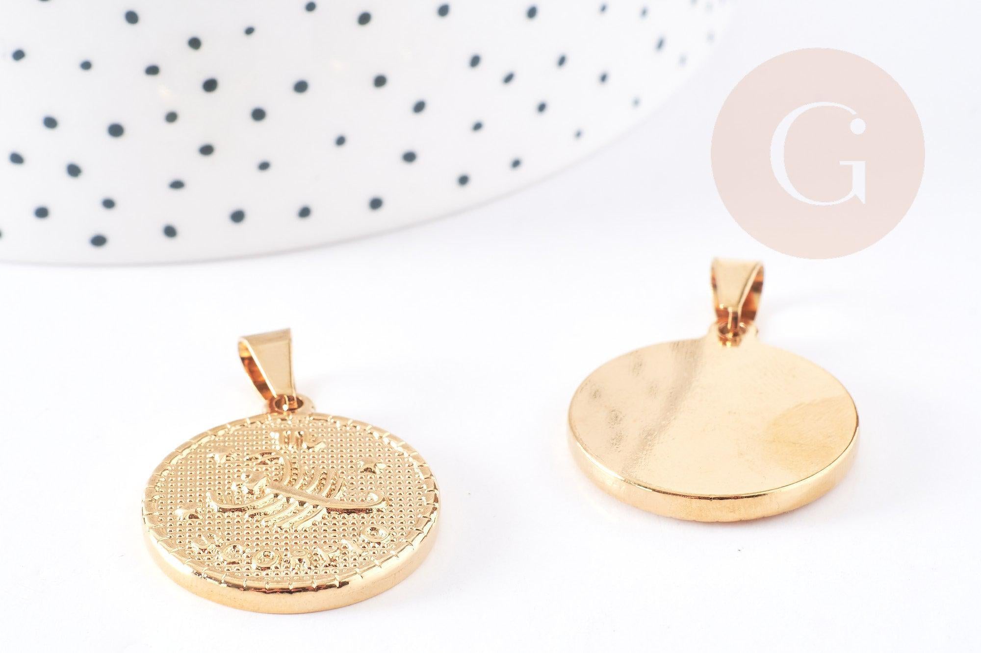 Colgante medalla redonda Escorpión en acero dorado, signo astrológico, colgante dorado, sin níquel, latón dorado, creación de joyas, medalla de oro, 2,9 cm