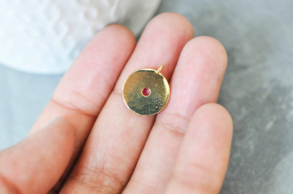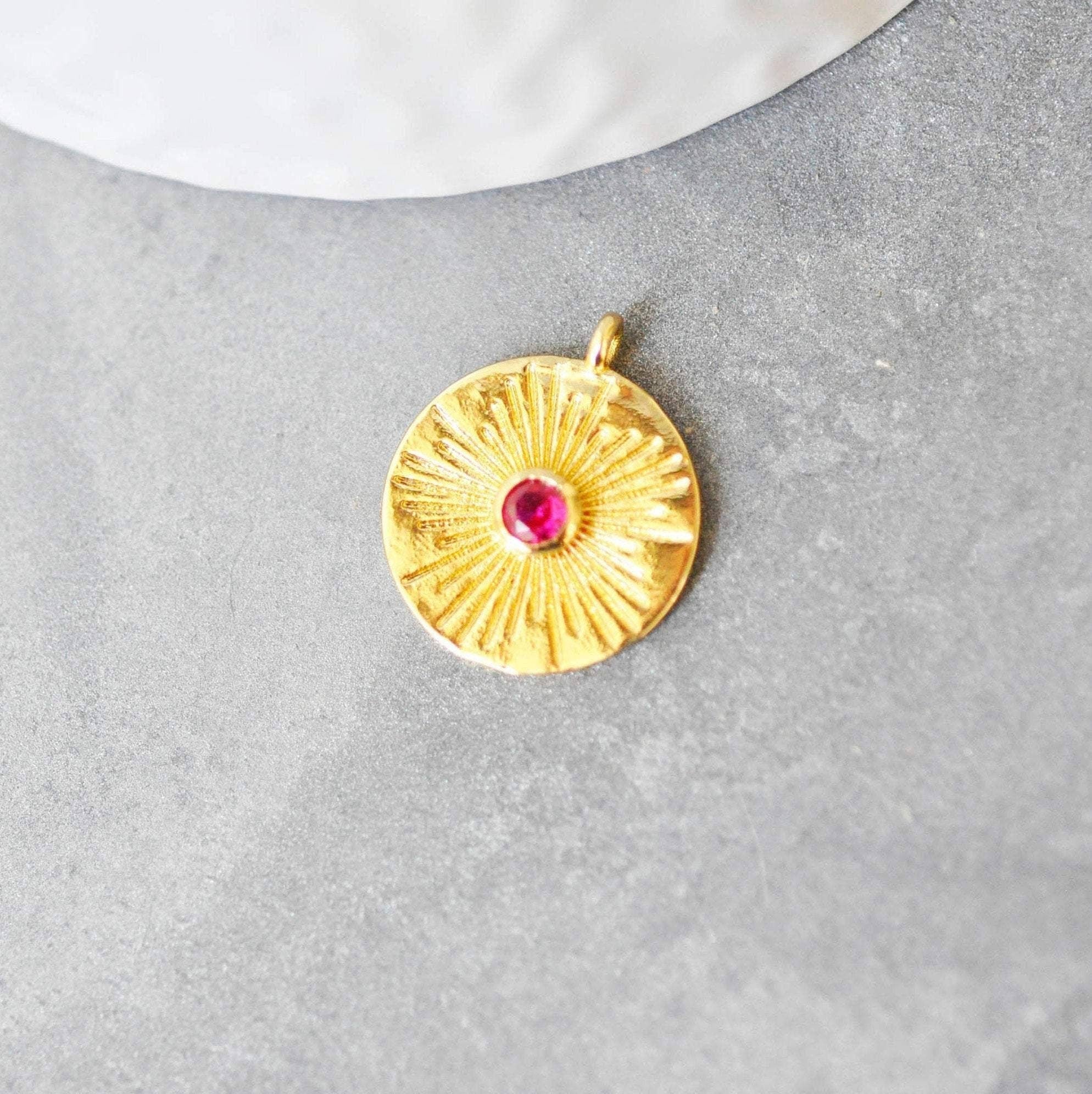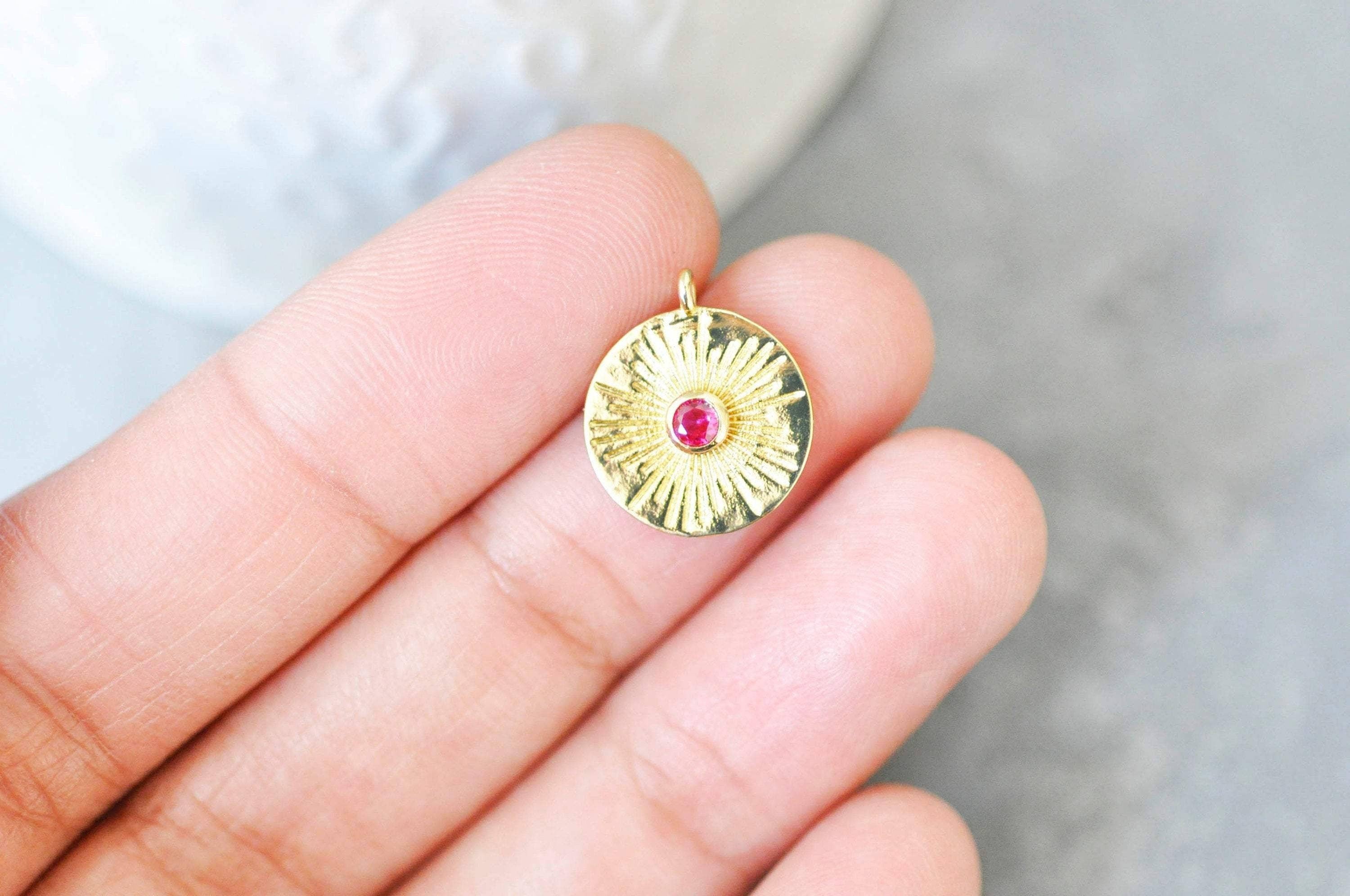Añade un toque de luz y simbolismo solar a tus creaciones con este colgante redondo de sol en latón bañado en oro . Adornado con una vibrante circonita roja, representa un sol estilizado, perfecto para joyas que transmiten calidez y positividad.
