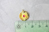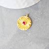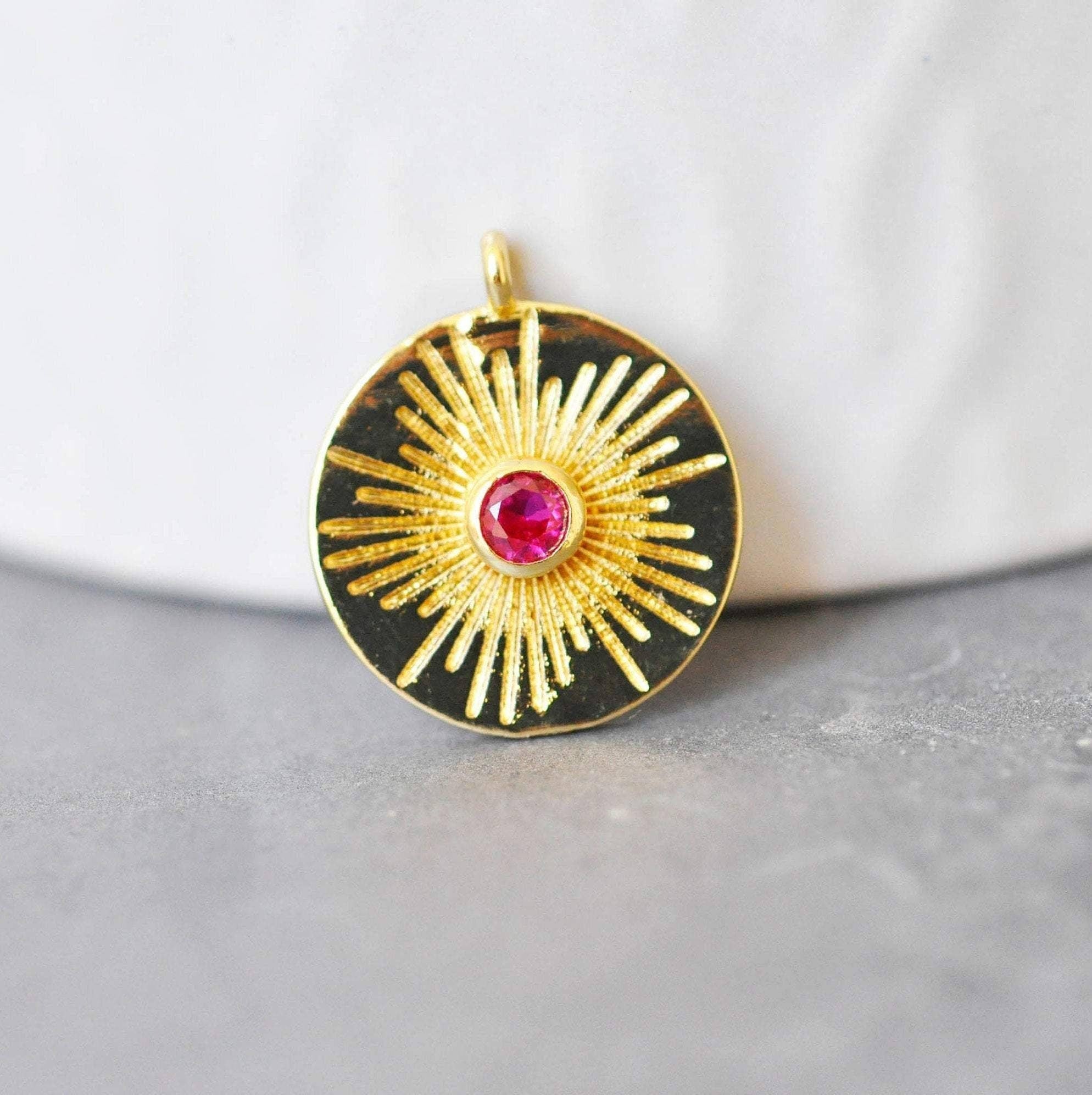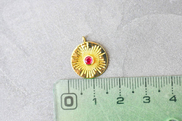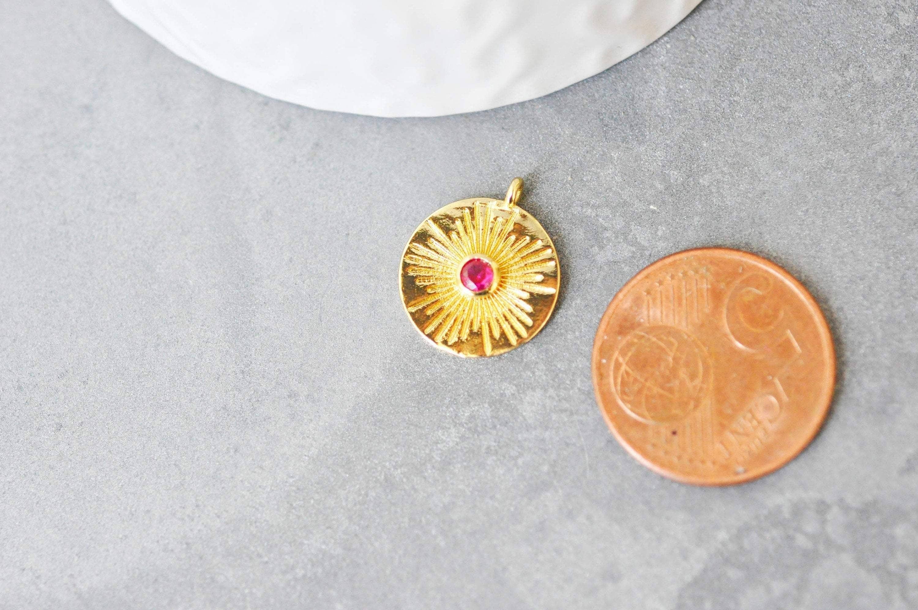 Colgante de medalla de sol redonda con latón bañado en oro y circonita roja, 16,5 mm, x1 (G3473)