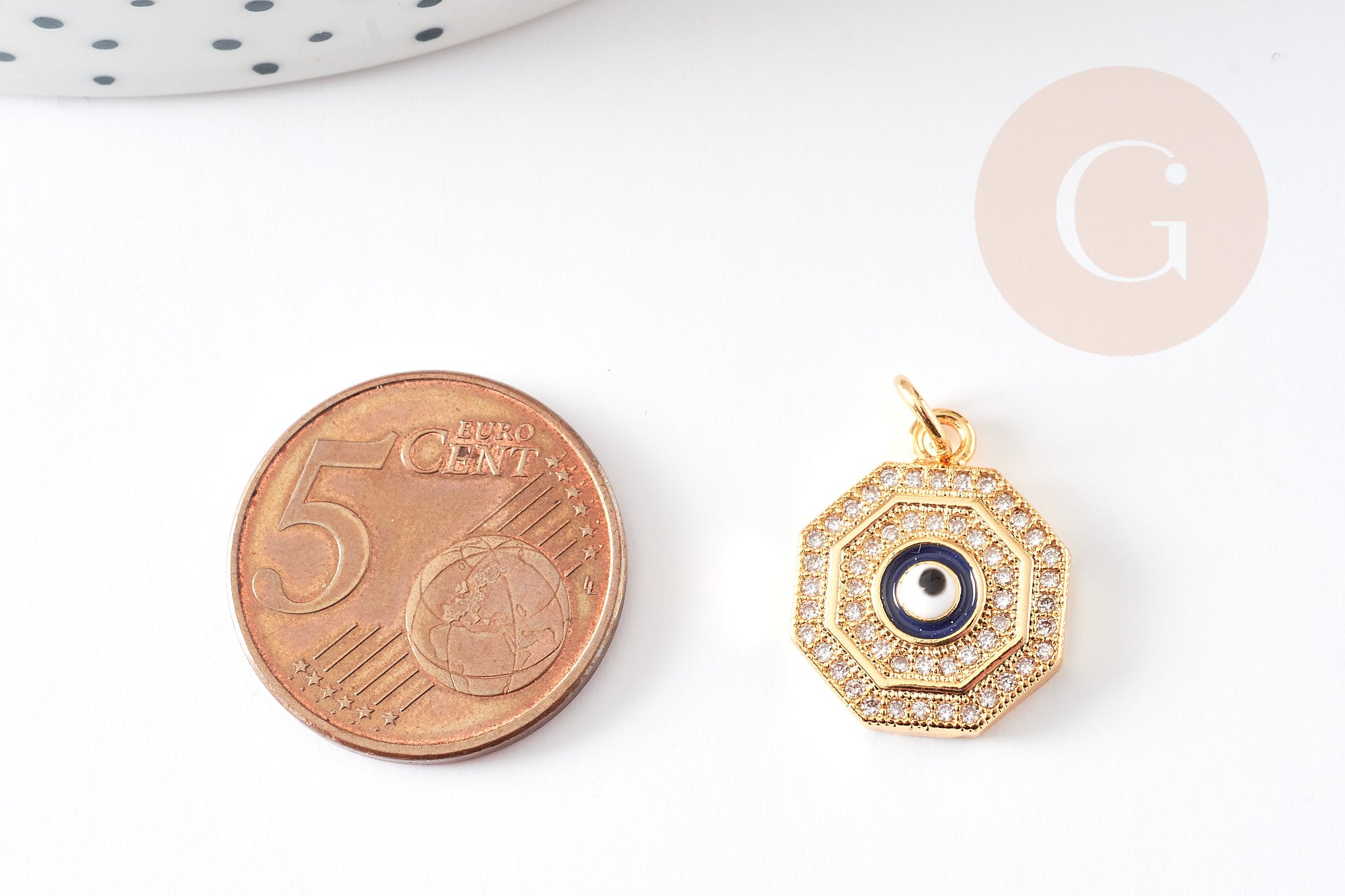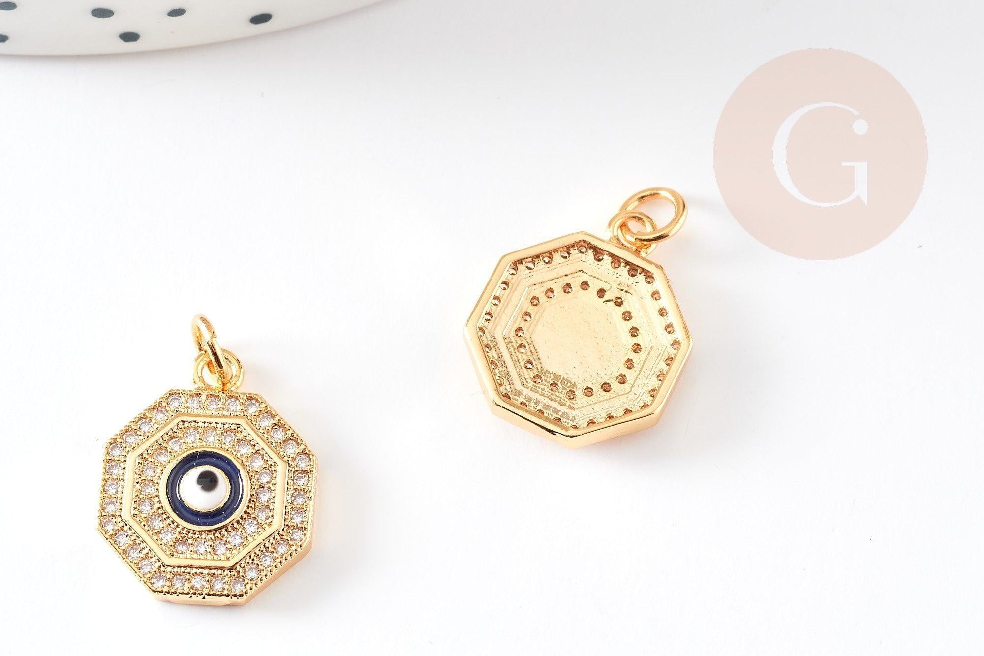 Descubra el colgante ojo de latón dorado con circonitas octogonales y cristal de 17 mm , una pieza de la suerte dorada perfecta para crear joyas.
