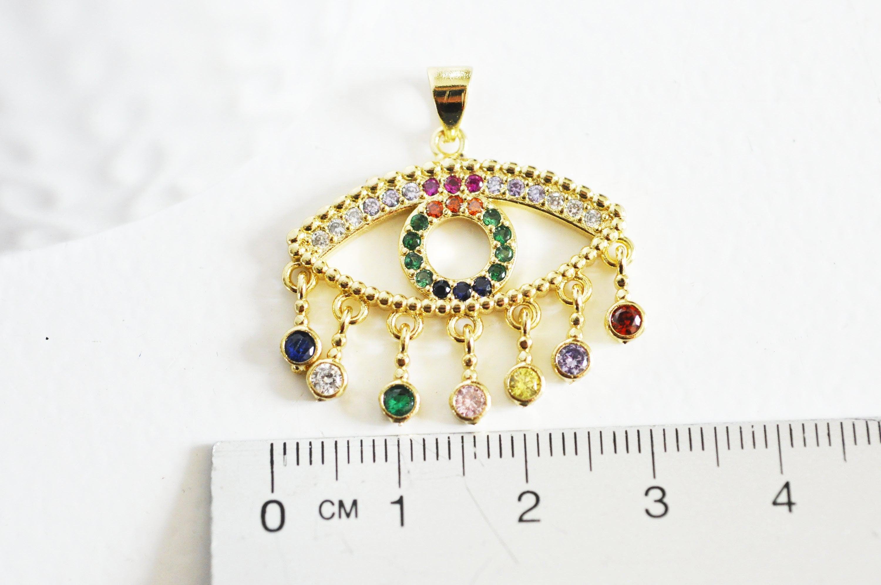 Colgante de ojo dorado con cristal de circonio de colores, amuleto de la suerte en latón dorado contra el mal de ojo para la creación de joyas, 28 mm, cada uno Un colgante de ojo dorado decorado con dijes dorados...