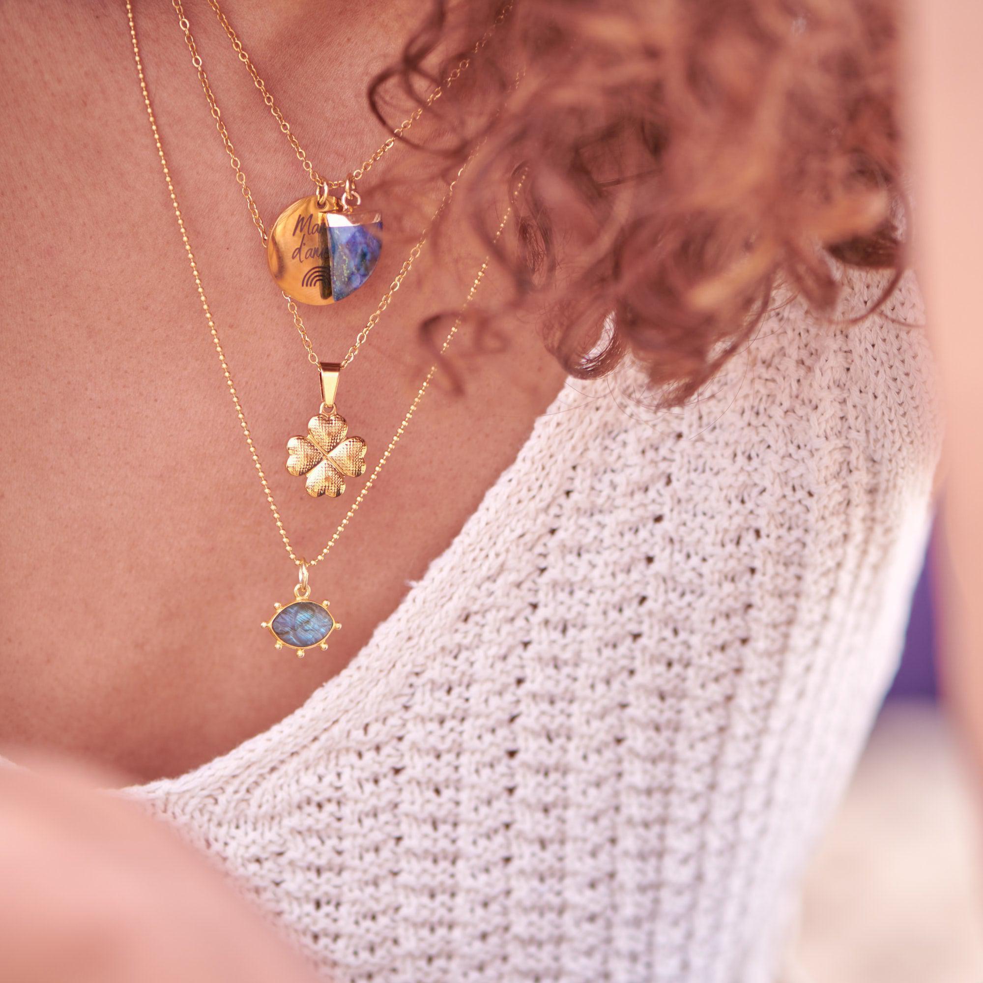 Déjese seducir por este colgante de ojo de labradorita natural con soporte de plata maciza 925 bañada en oro de 18 quilates.