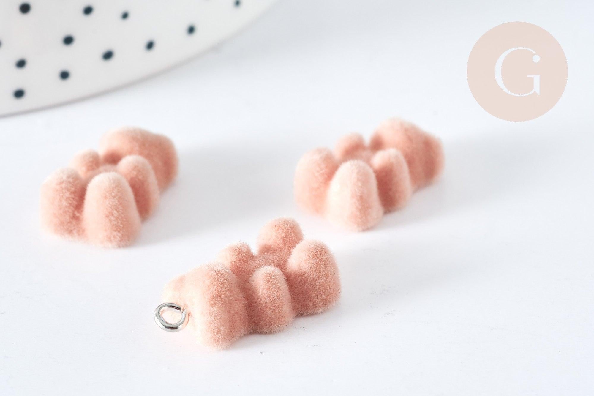 Colgante de osito de peluche flocado en terciopelo beige, resina platino, 22 mm, colgante de infancia regresiva, x2 (G8129)