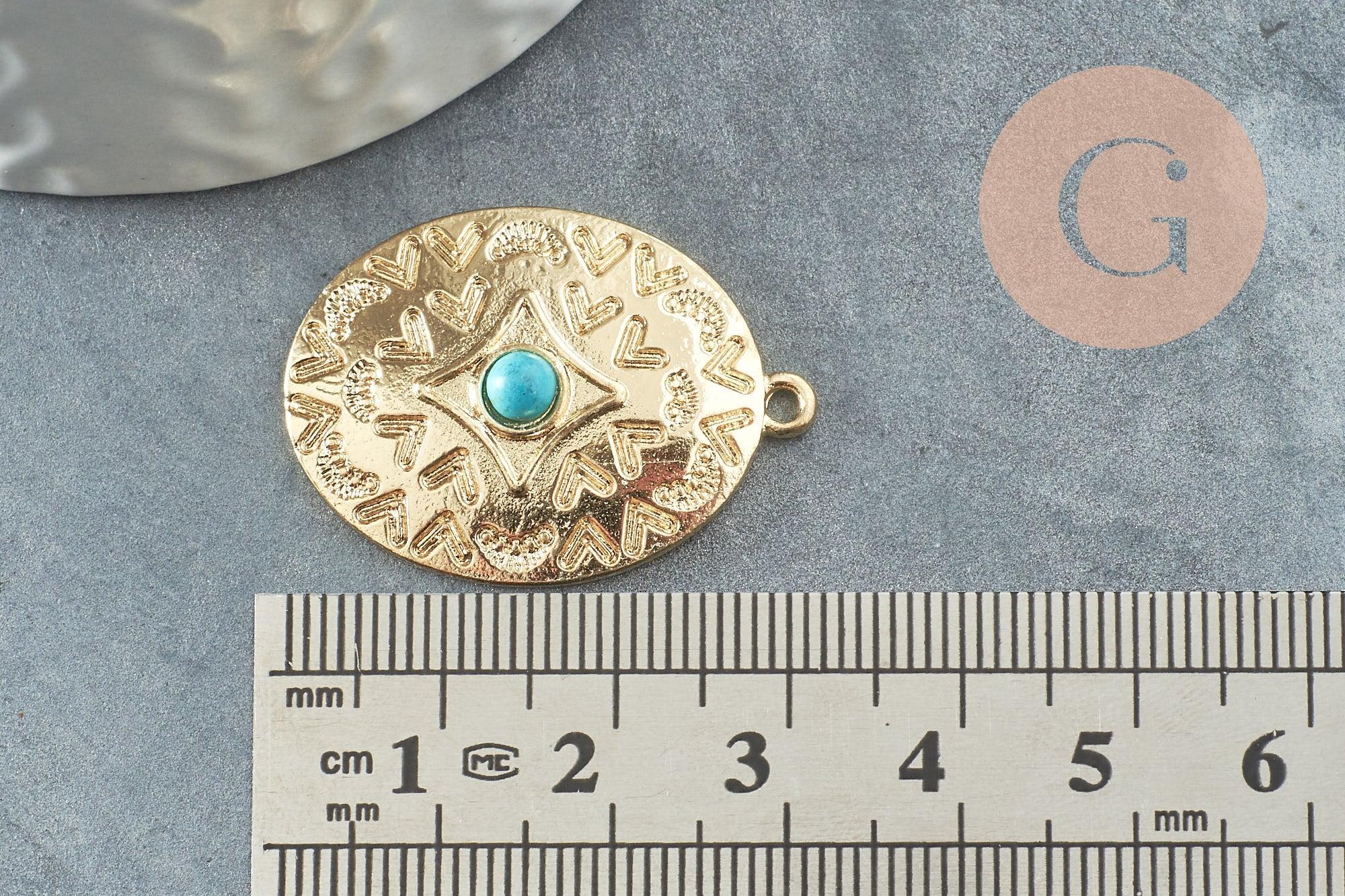 Colgante ovalado de zamac, bañado en oro de 16 quilates, grabado con turquesa sintética, sin níquel, creación de joyería de inspiración india, 31,5 mm, x1 (G4526)