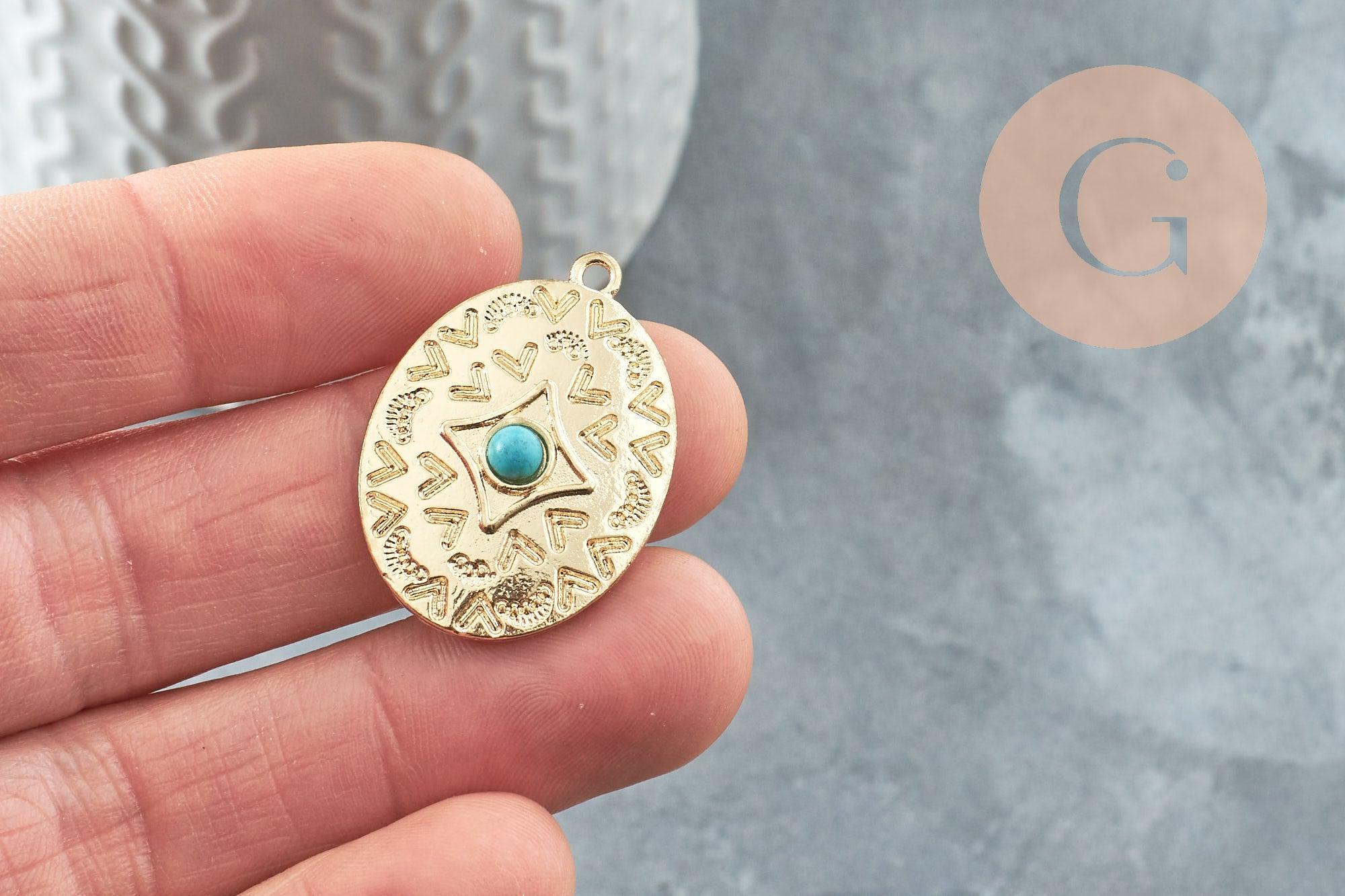 Adopta ya este colgante grabado en zamac bañado en oro de 16K, con una turquesa sintética en el centro: ideal para crear pendientes, pulseras y collares.