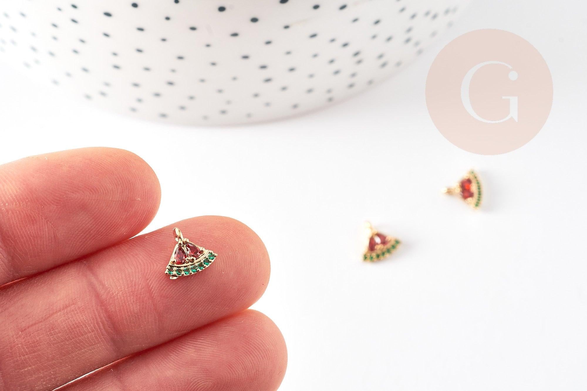 Colgante sandía de latón bañado en oro con circonitas verdes rojas 8 mm, colgante de fruta para la creación de bisutería, x1 G9171