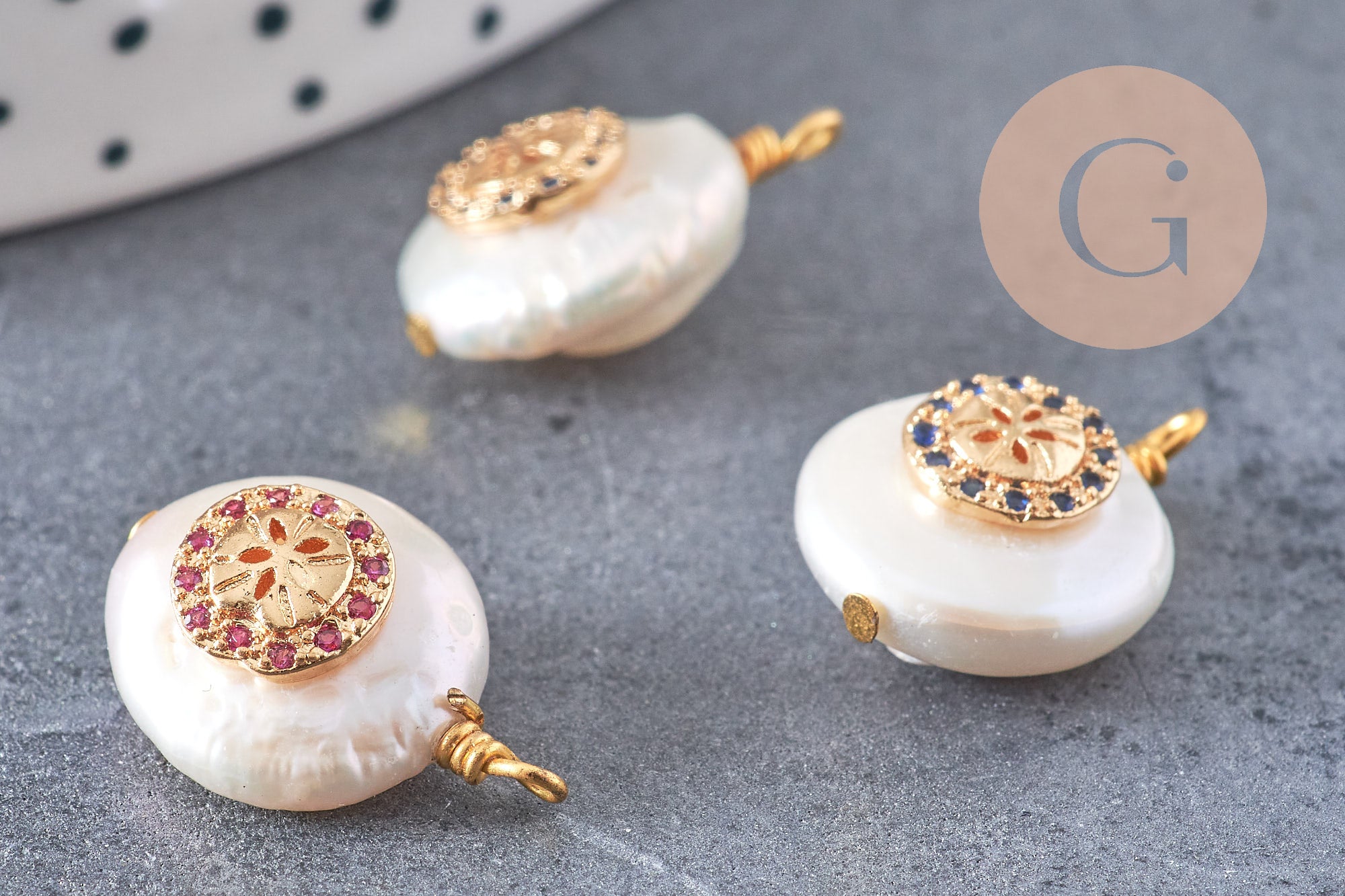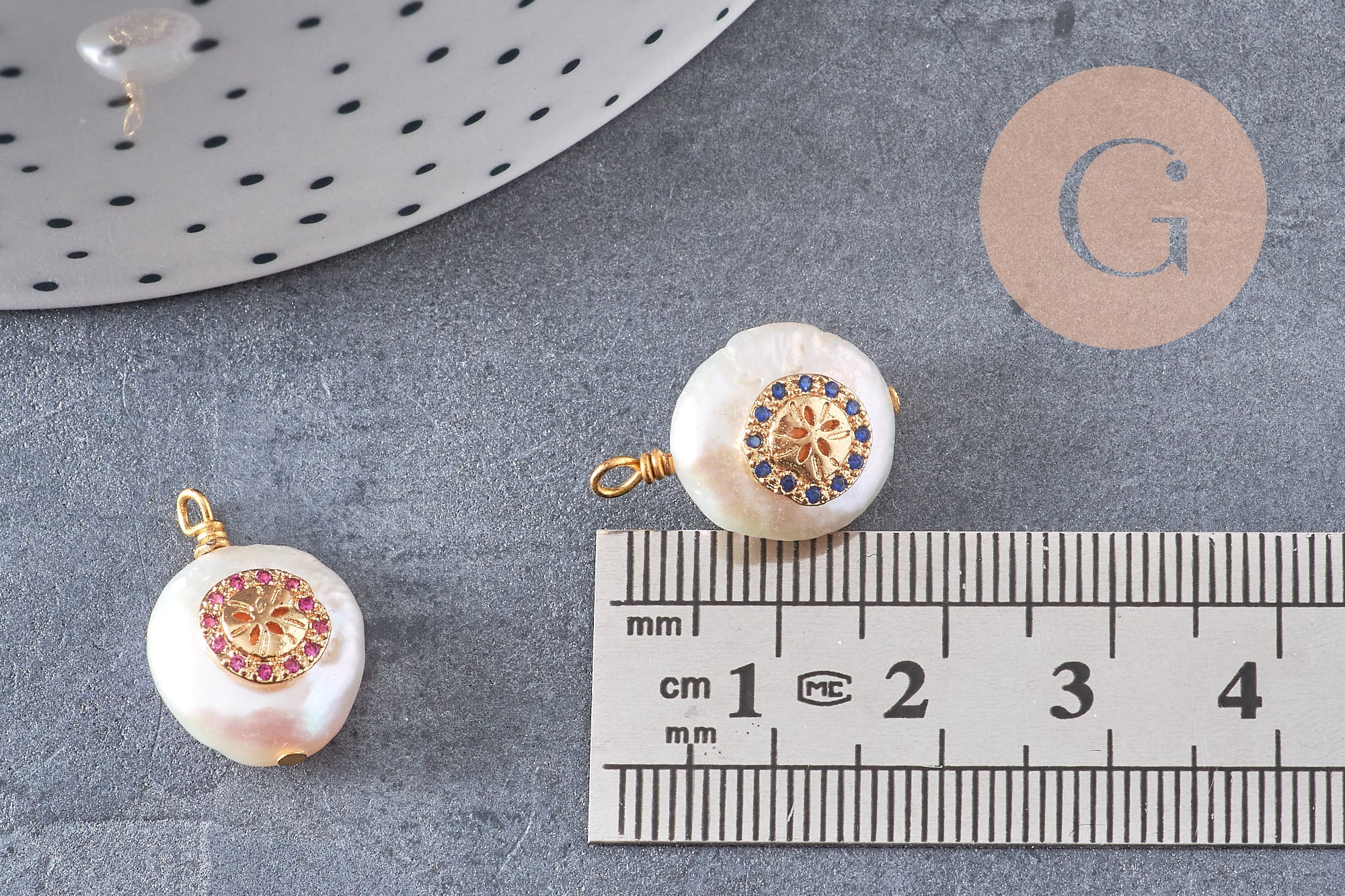 Perla Keshi natural y montura de latón chapado en oro, decorada con una pequeña flor de la suerte adornada con circonitas de colores.
