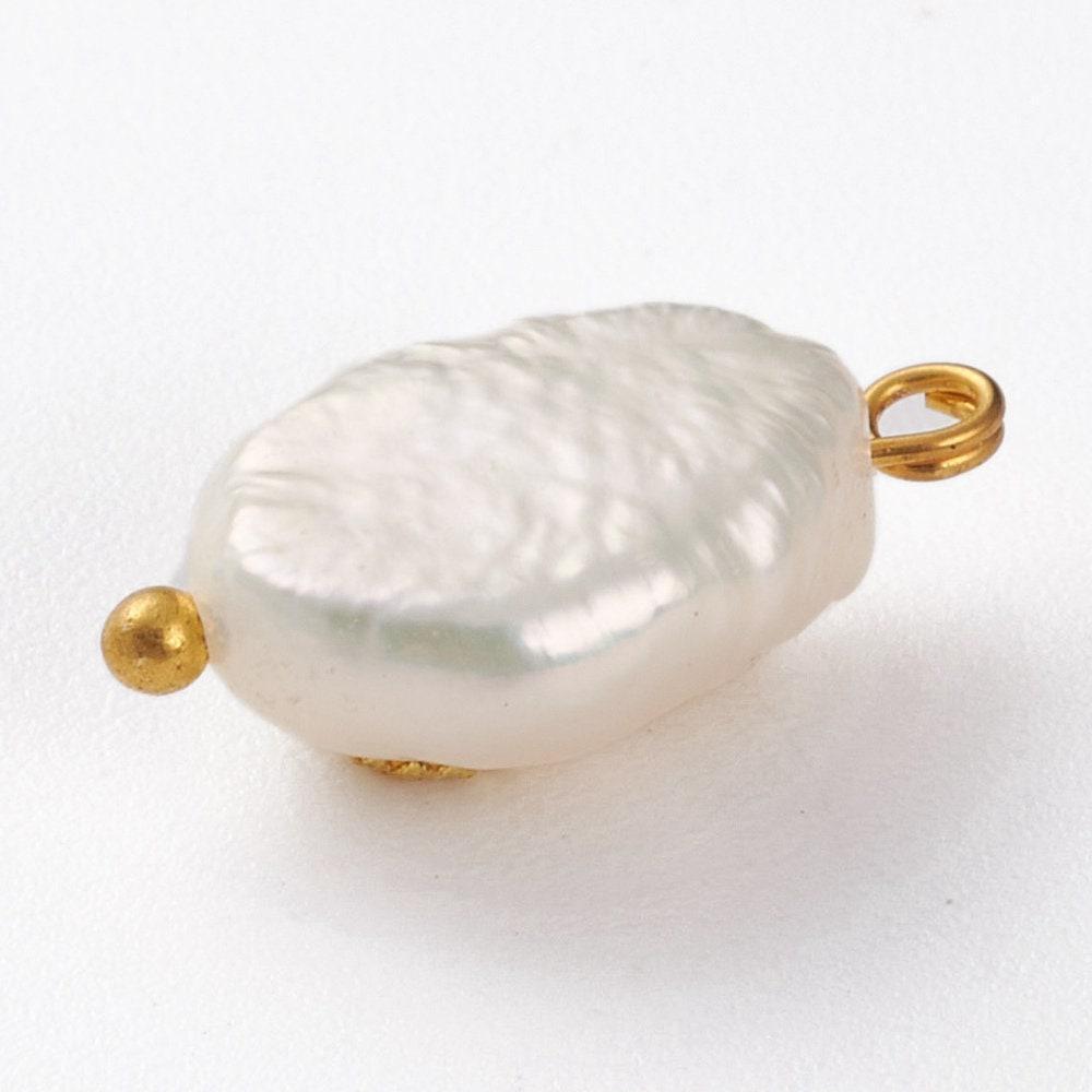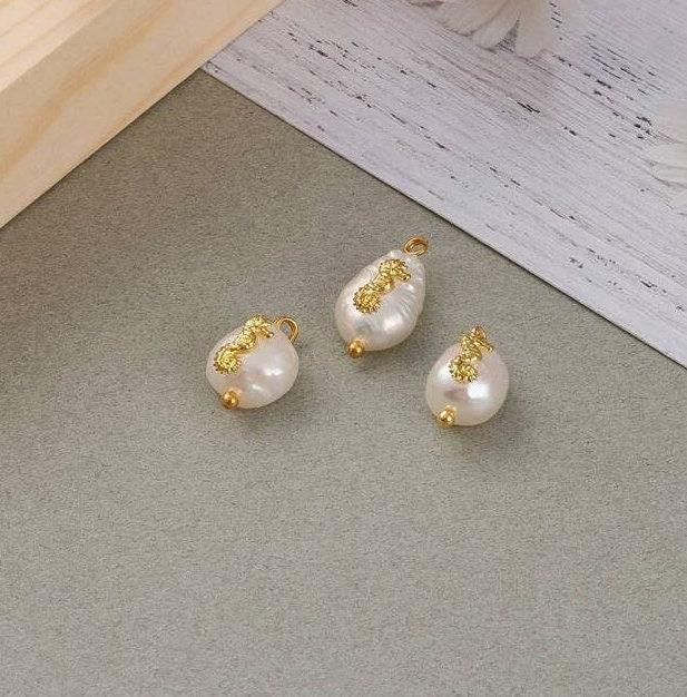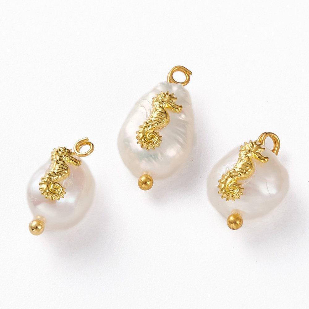 Colgante de Perla Keshi natural decorado con un acabado de caballito de mar de zamac dorado, sobre soporte de latón dorado. ¡Su forma irregular lo hace especialmente adecuado para crear joyas DIY originales y modernas!