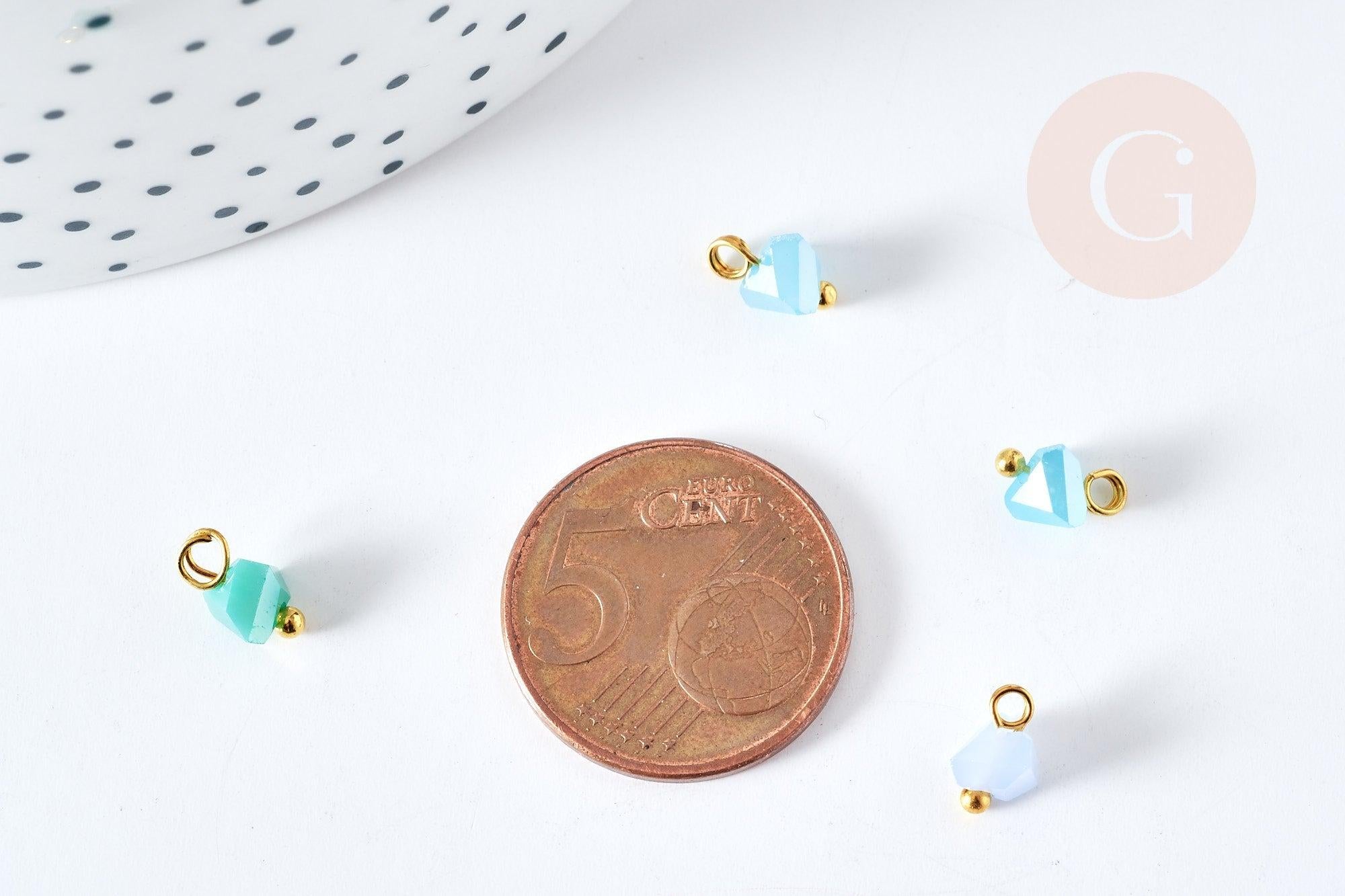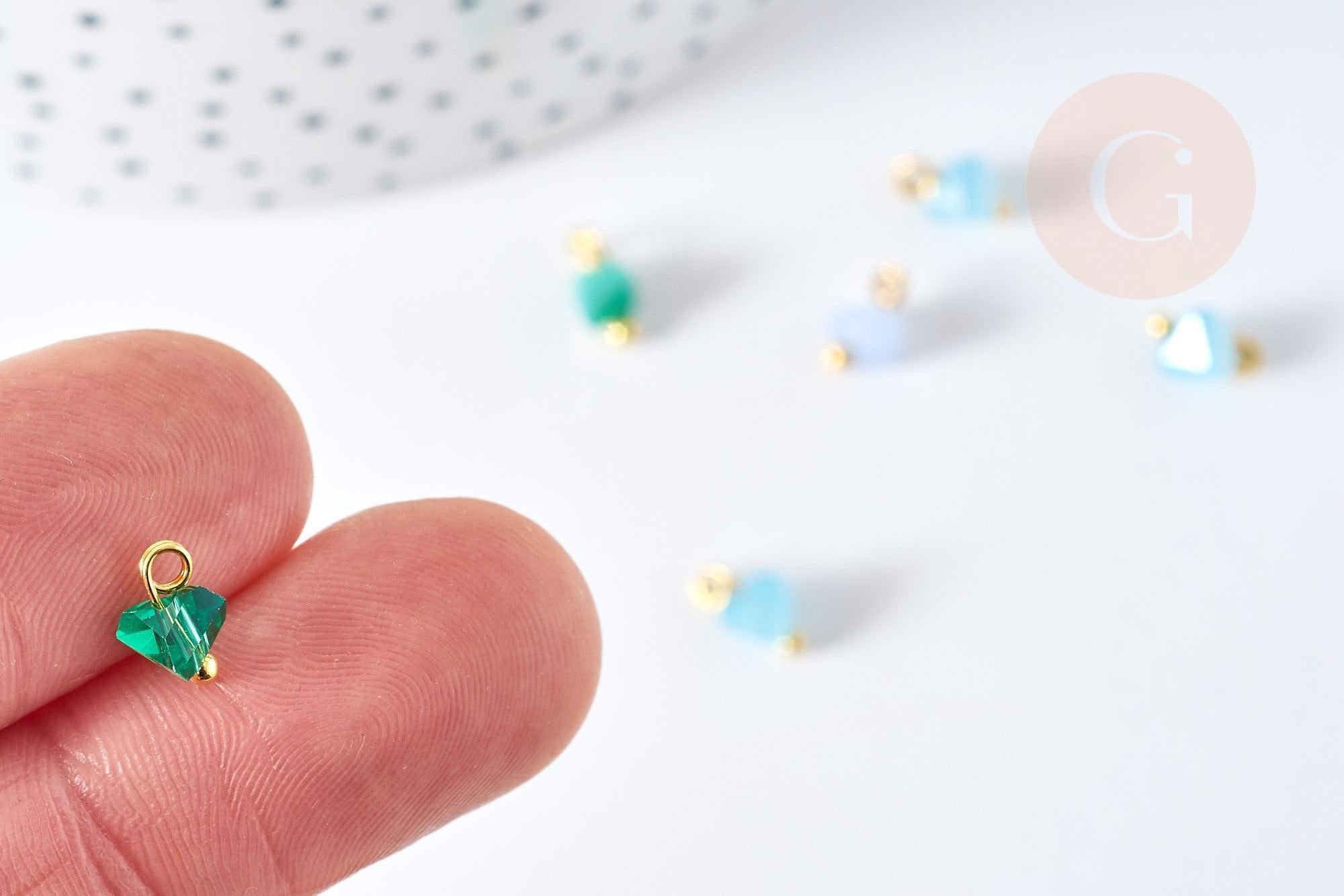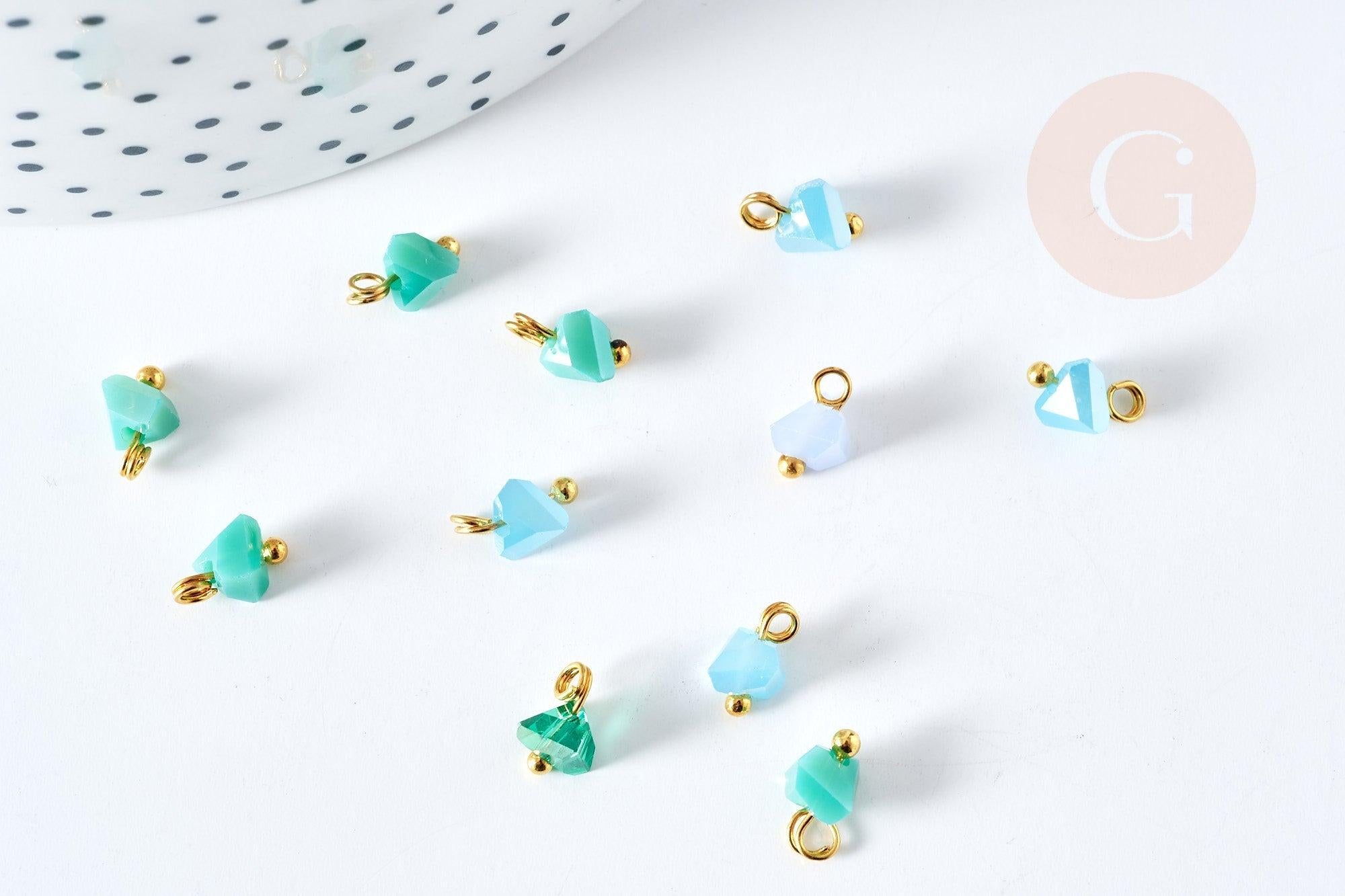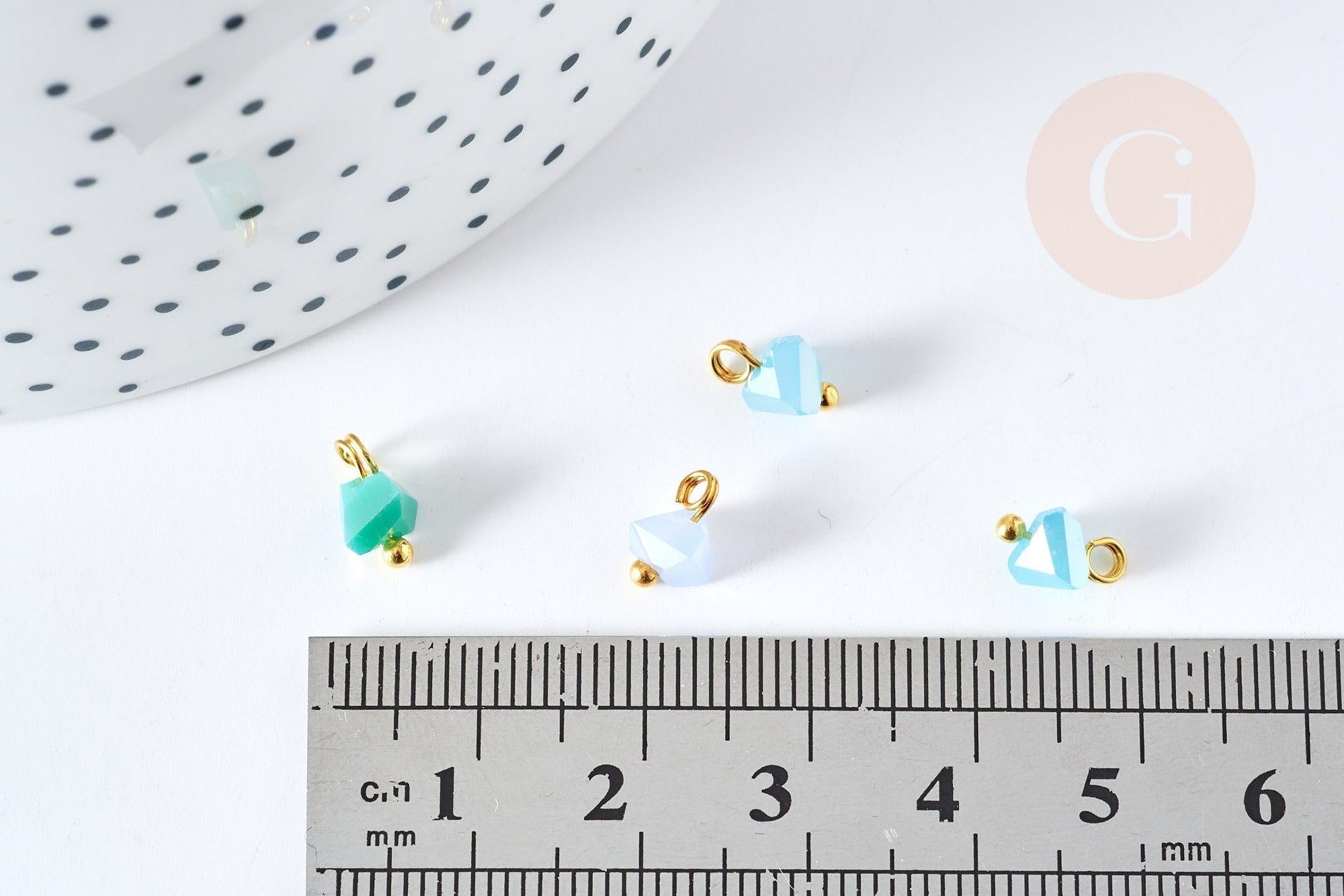 Déjese seducir por estos bonitos charms compuestos por perlas triangulares de cristal en tonos azul turquesa, sobre un soporte de latón dorado.