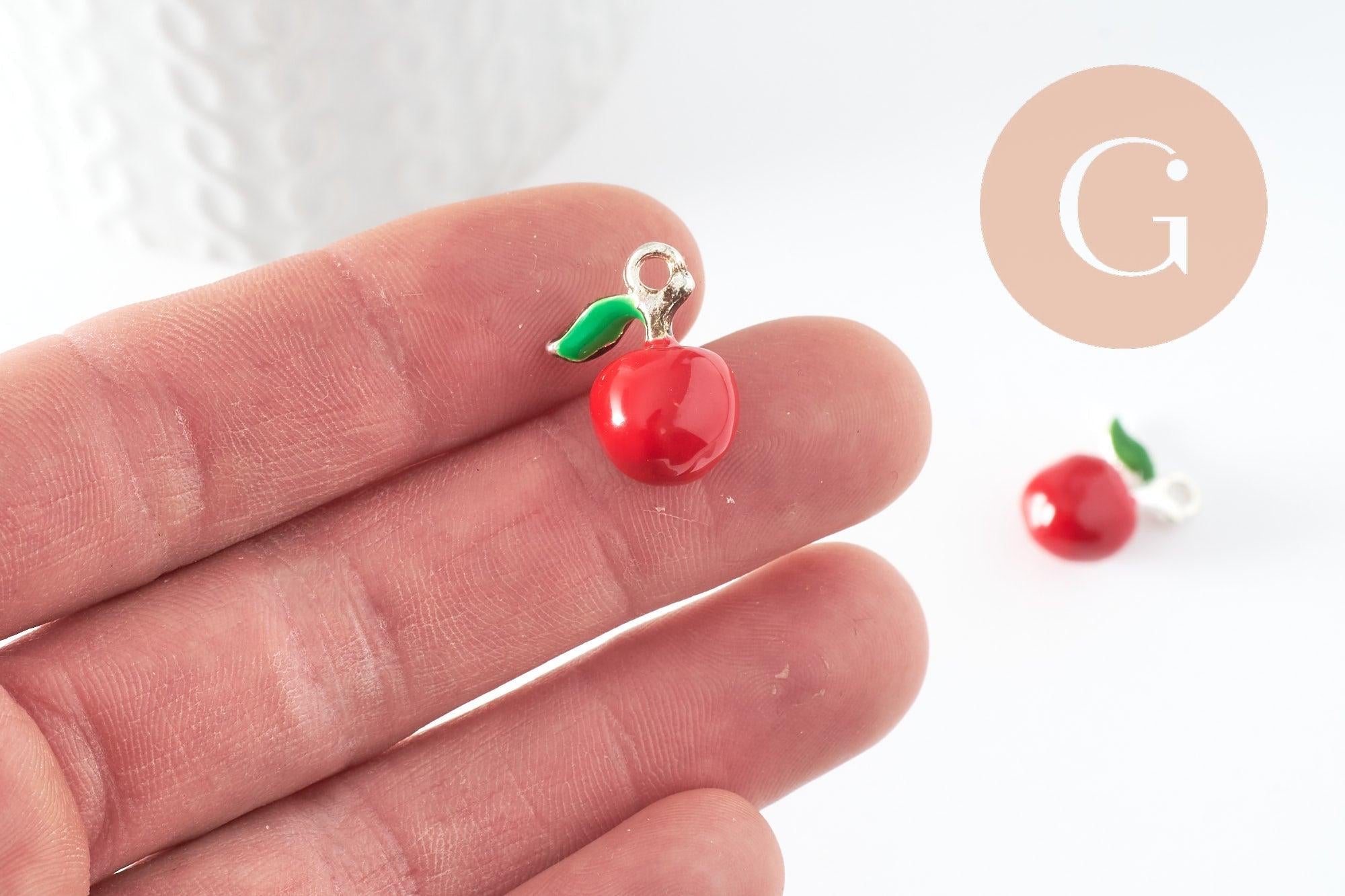 Un adorable colgante de manzana en zamac plateado recubierto de esmalte rojo y verde.