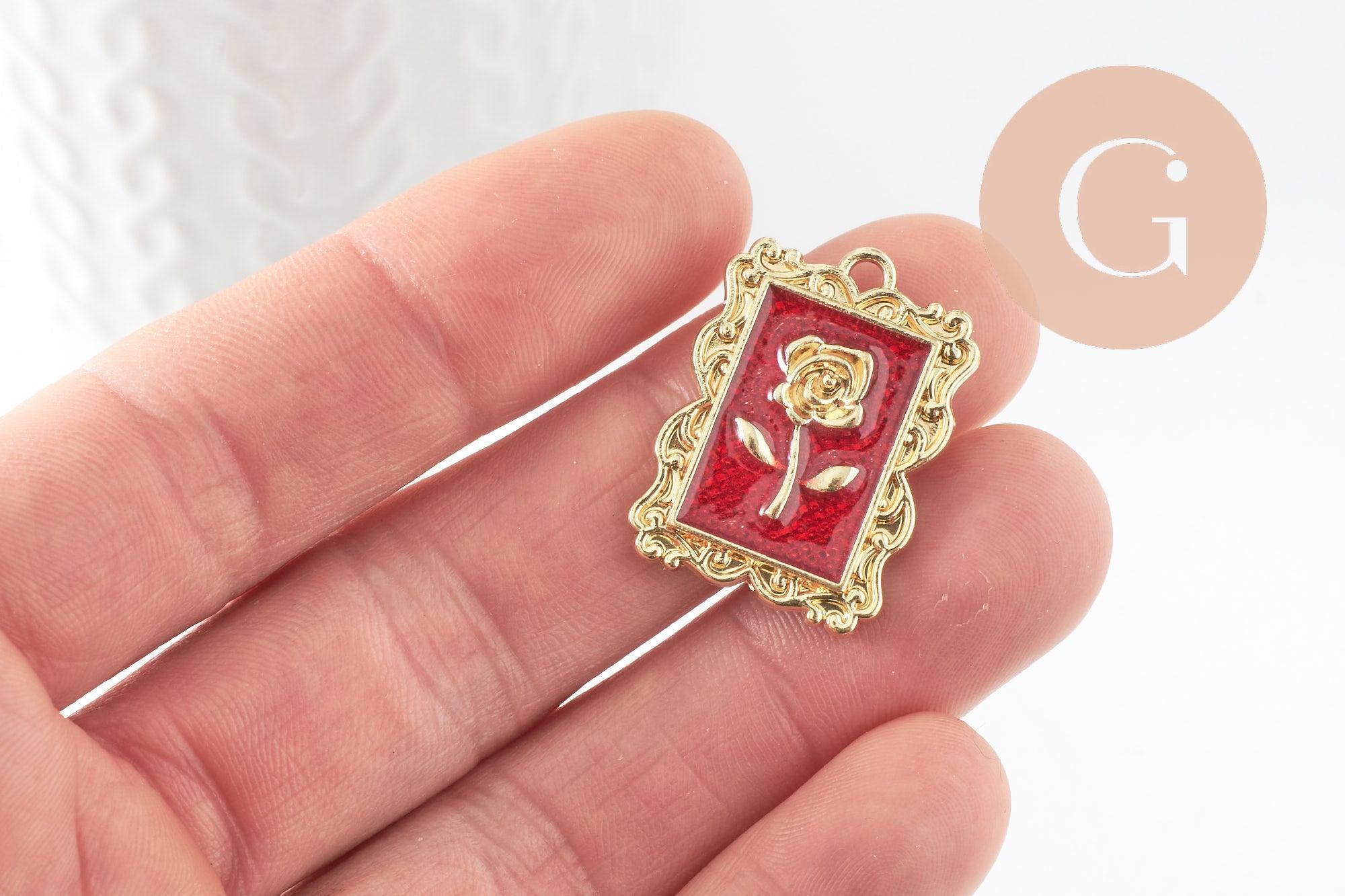Colgante rectángulo flor rosa esmalte rojo, colgante zamac oro, flor, colgante zamac oro, 27.5mm, x1 (G3713)