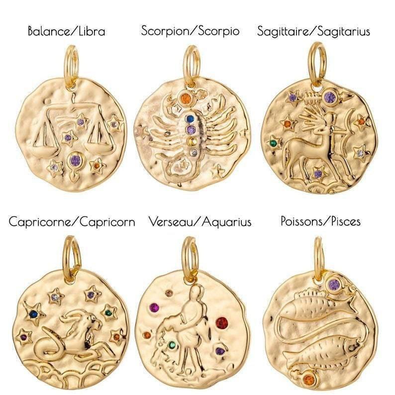 Enamórese de uno de los Charms redondos de latón bañado en oro representando una signo astrológico que será el elemento ideal para crear varios bisutería .