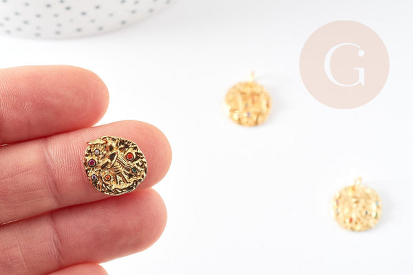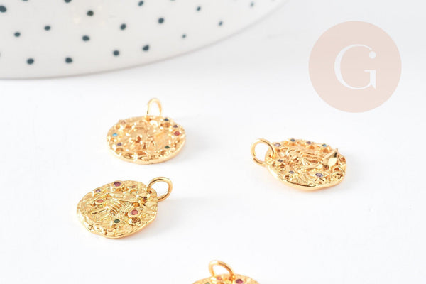 Colgante de constelación redondo de latón dorado con circonitas de colores de 14-15 mm, x1 (G5274)