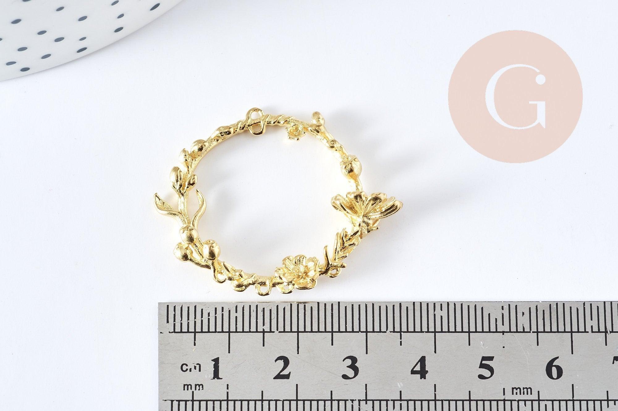 Colgante redondo de corona de flores de latón crudo de 38 mm, dije de latón crudo para crear joyas, x1 (G7434)