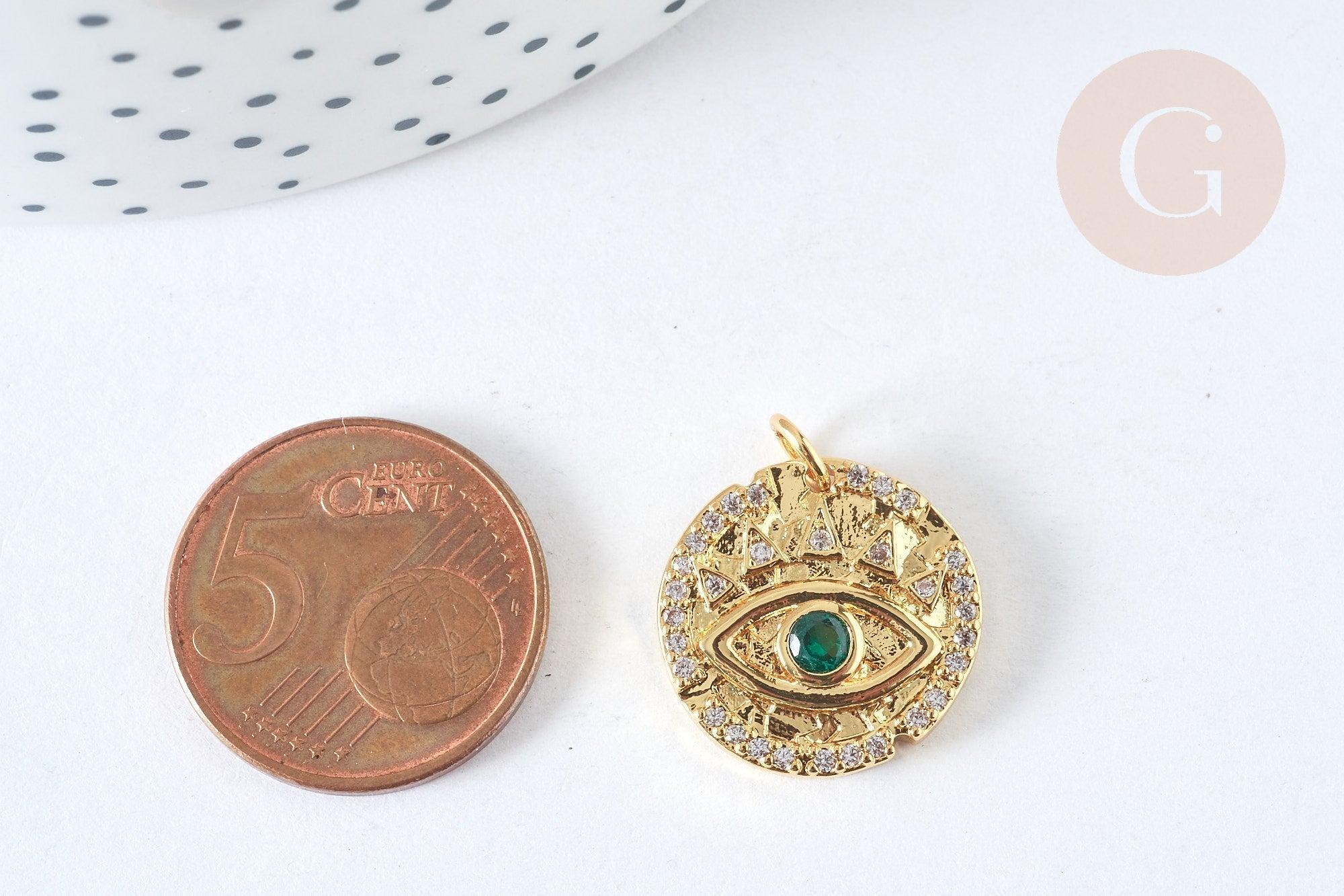 Este colgante redondo en El latón bañado en oro está decorado con un ojo malvado con un circón verde y espolvoreado con circonita cúbica blanca. Este te permitirá crear increíbles Bisutería DIY sobre el tema de Joyas místicas .
