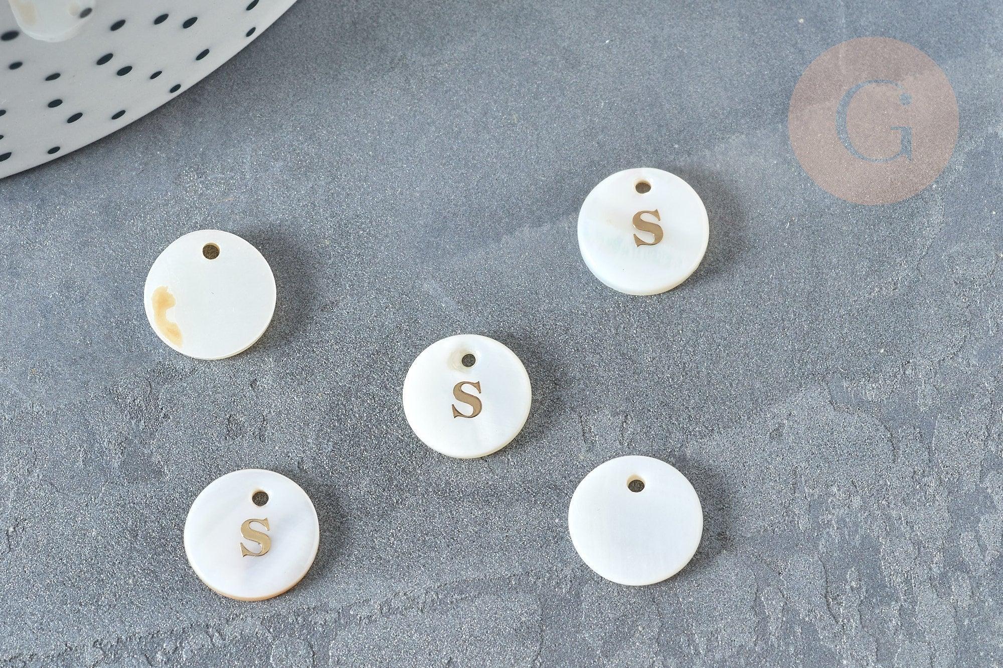 Un colgante conector redondo en nácar blanco con letra mayúscula dorada, un acabado perfecto para completar un collar, un sautoir o unos pendientes.