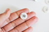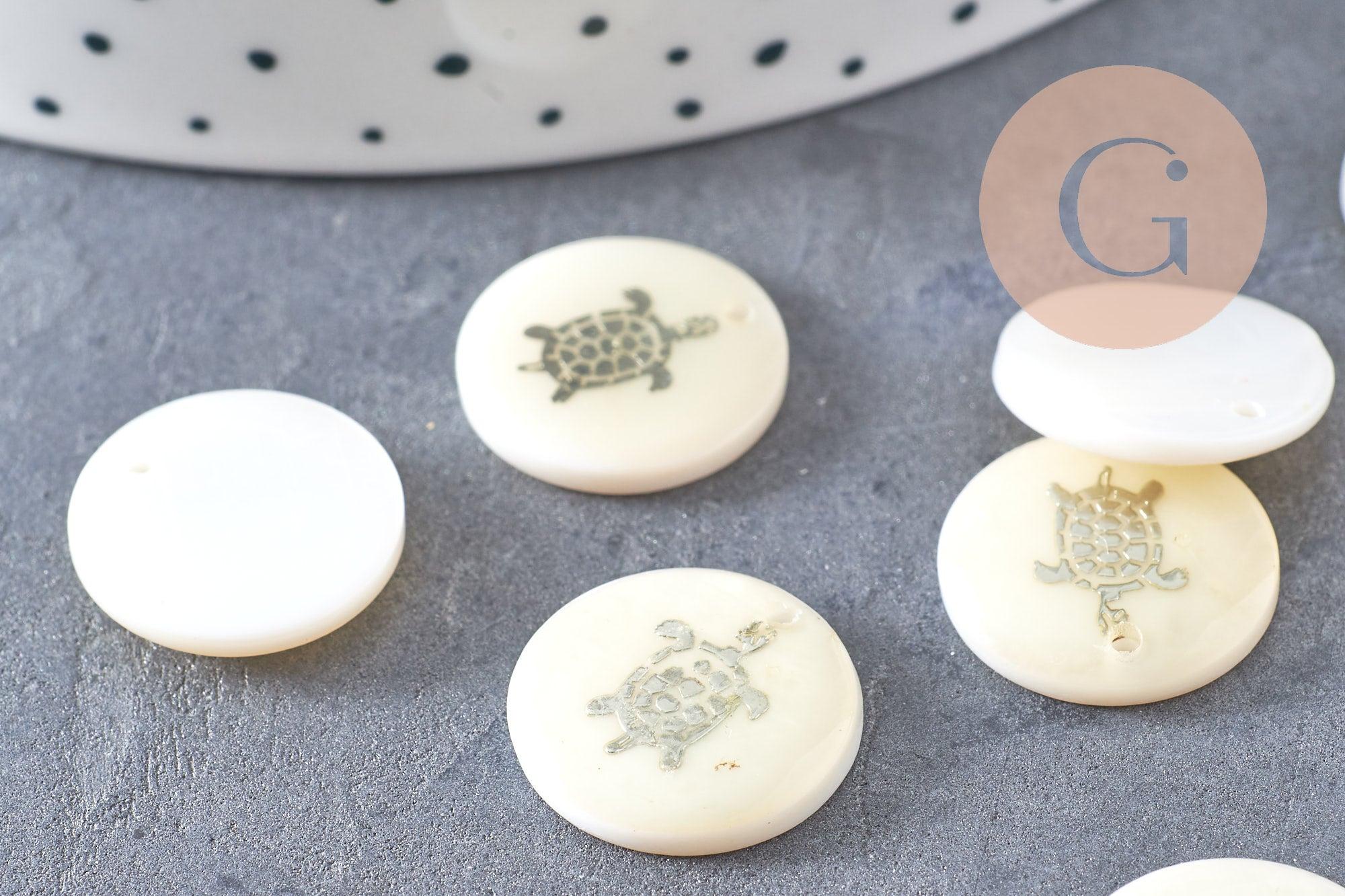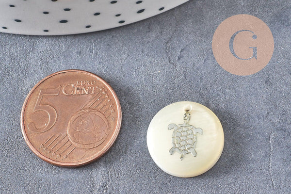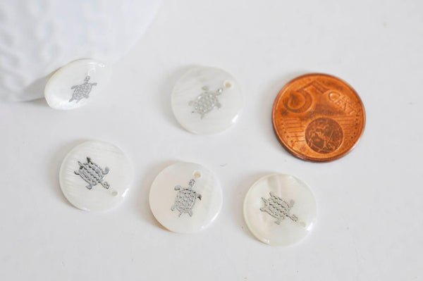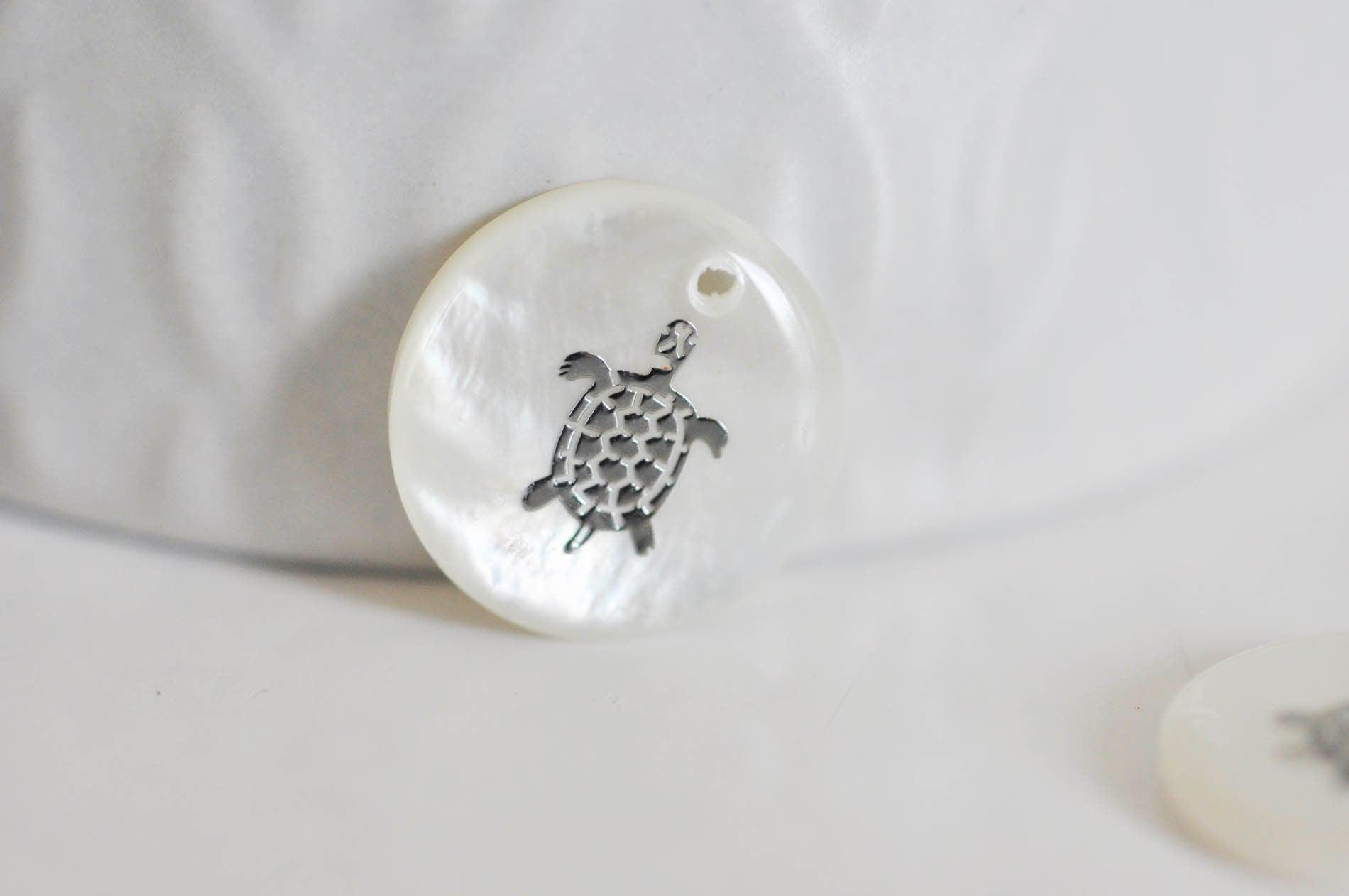 Colgante conector redondo de nácar blanco con motivo plateado de una tortuga 🐢.
