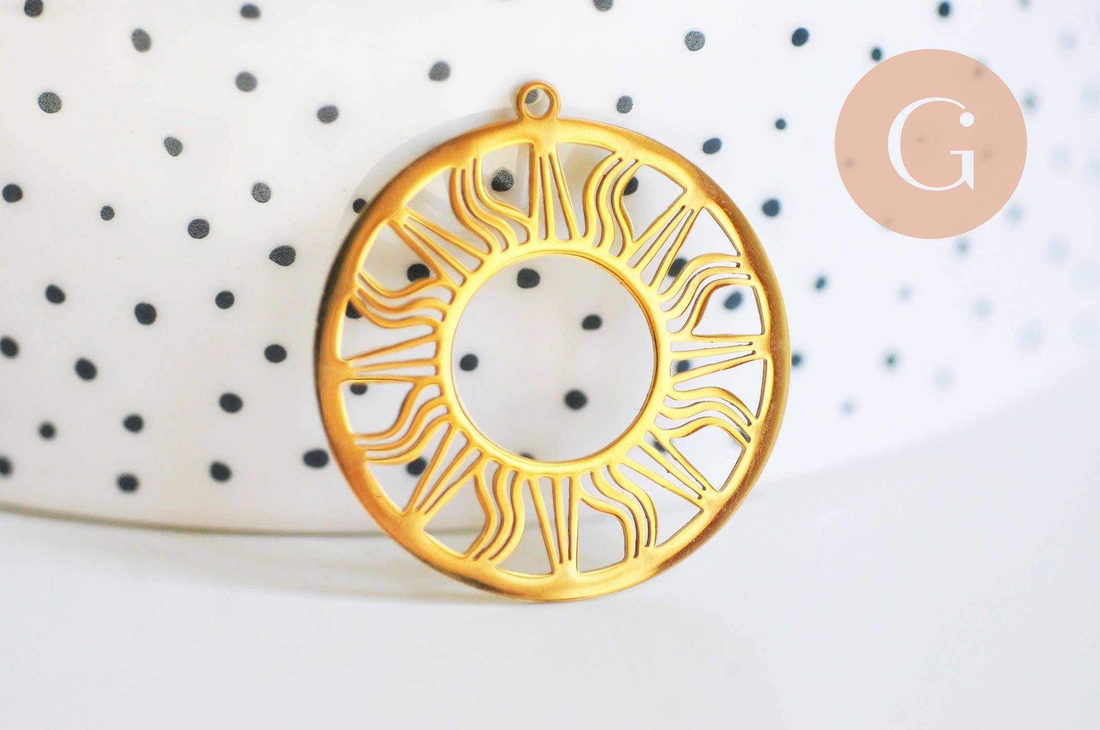 Un magnífico colgante de sol en acero inoxidable bañado en oro , en forma de medalla redonda de filigrana. , para usar en todas tus creaciones de aretes y collares.