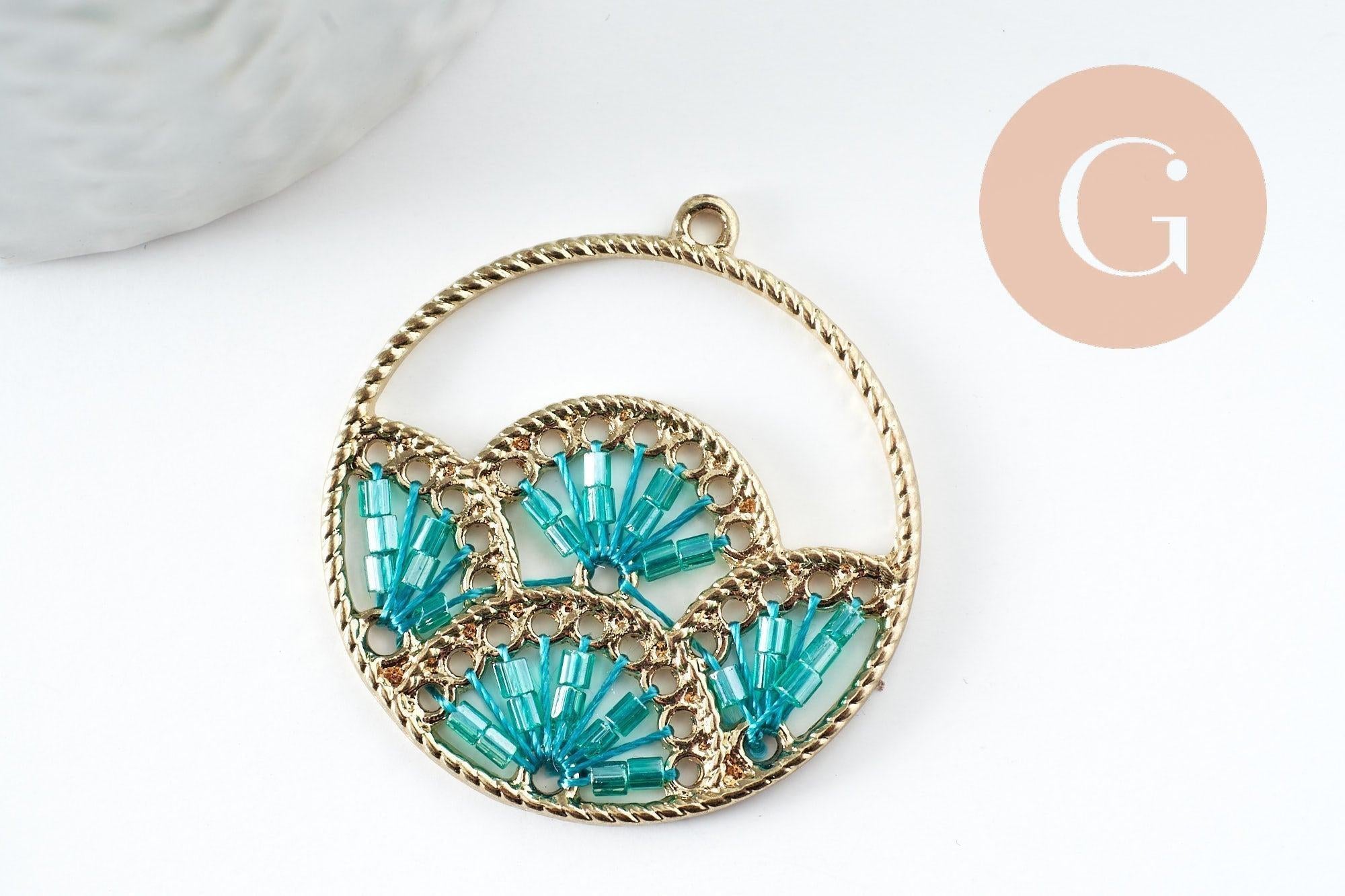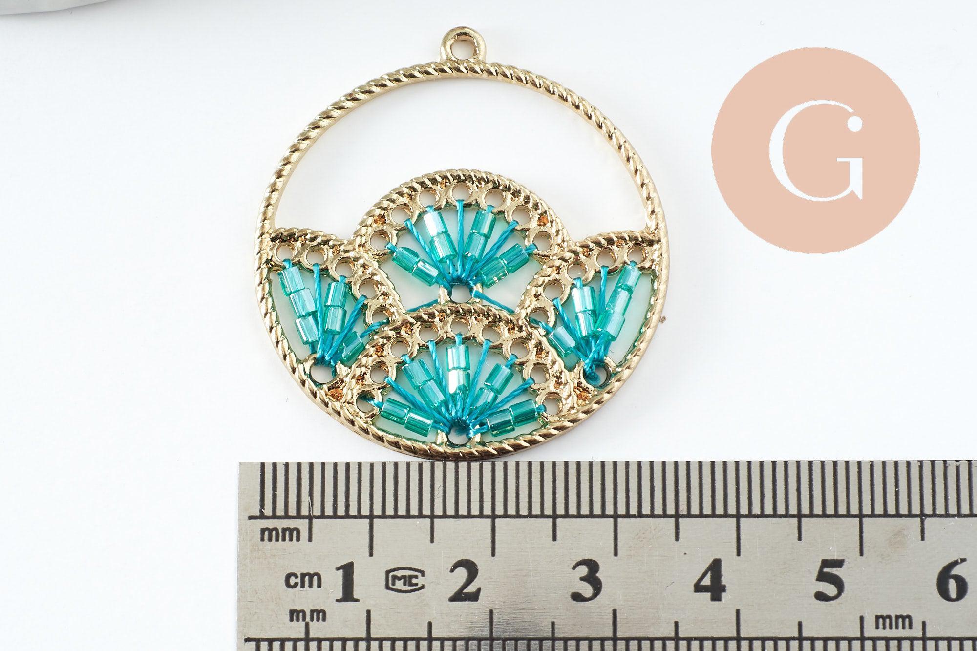 Colgante redondo de zamac dorado tejido con encaje rocaille verde turquesa 37.5mm, x2 (G4133)