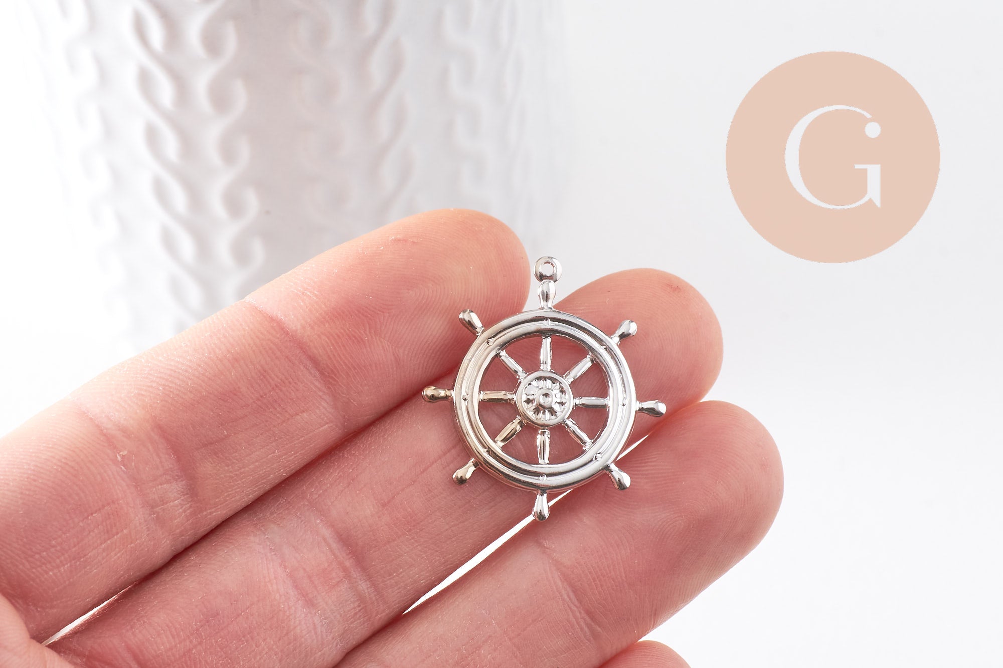Un bonito colgante con forma de rueda de barco en metal plateado, ideal para crear un collar de temática náutica, el mar y los barcos.