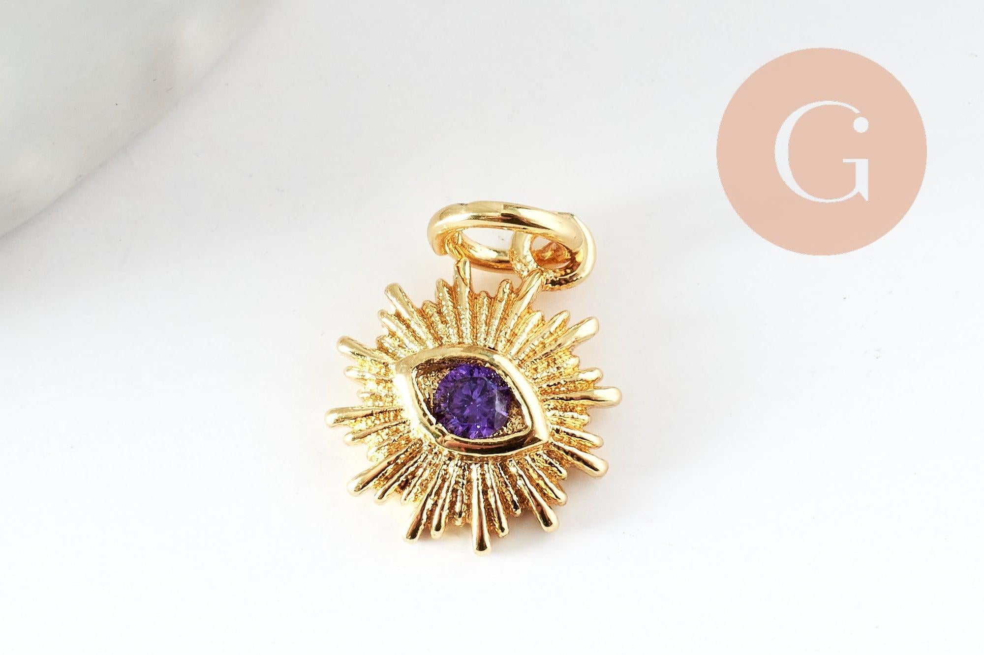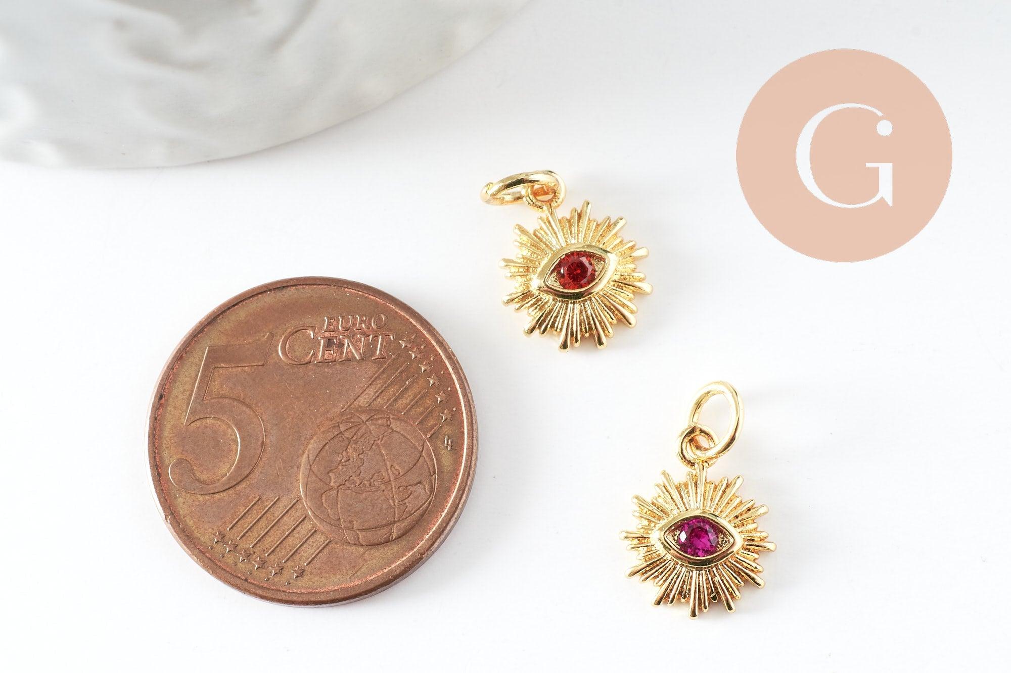 Para crear magníficos collares, pendientes y pulseras, adopte este pequeño colgante Lucky sol de latón dorado, adornado con pequeñas circonitas de colores brillantes.