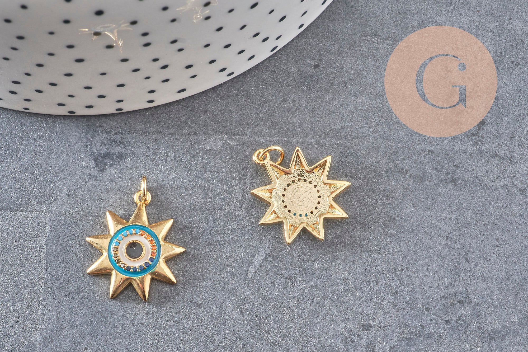 Colgante de sol con ojo de cristal de circonio de esmalte azul, colgante dorado, amuleto de la suerte, latón dorado, colgante de sol, 21,5 mm, cada uno