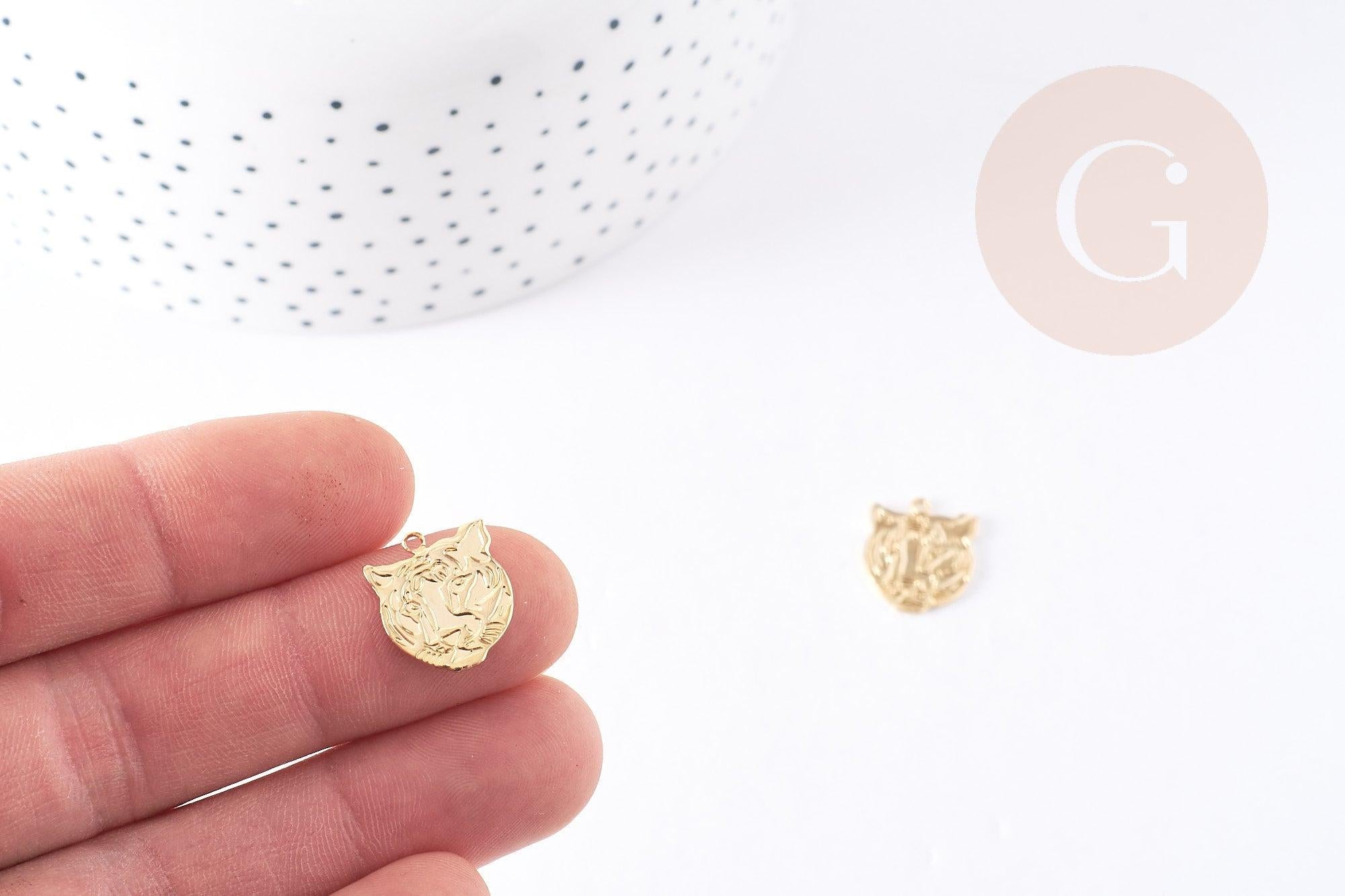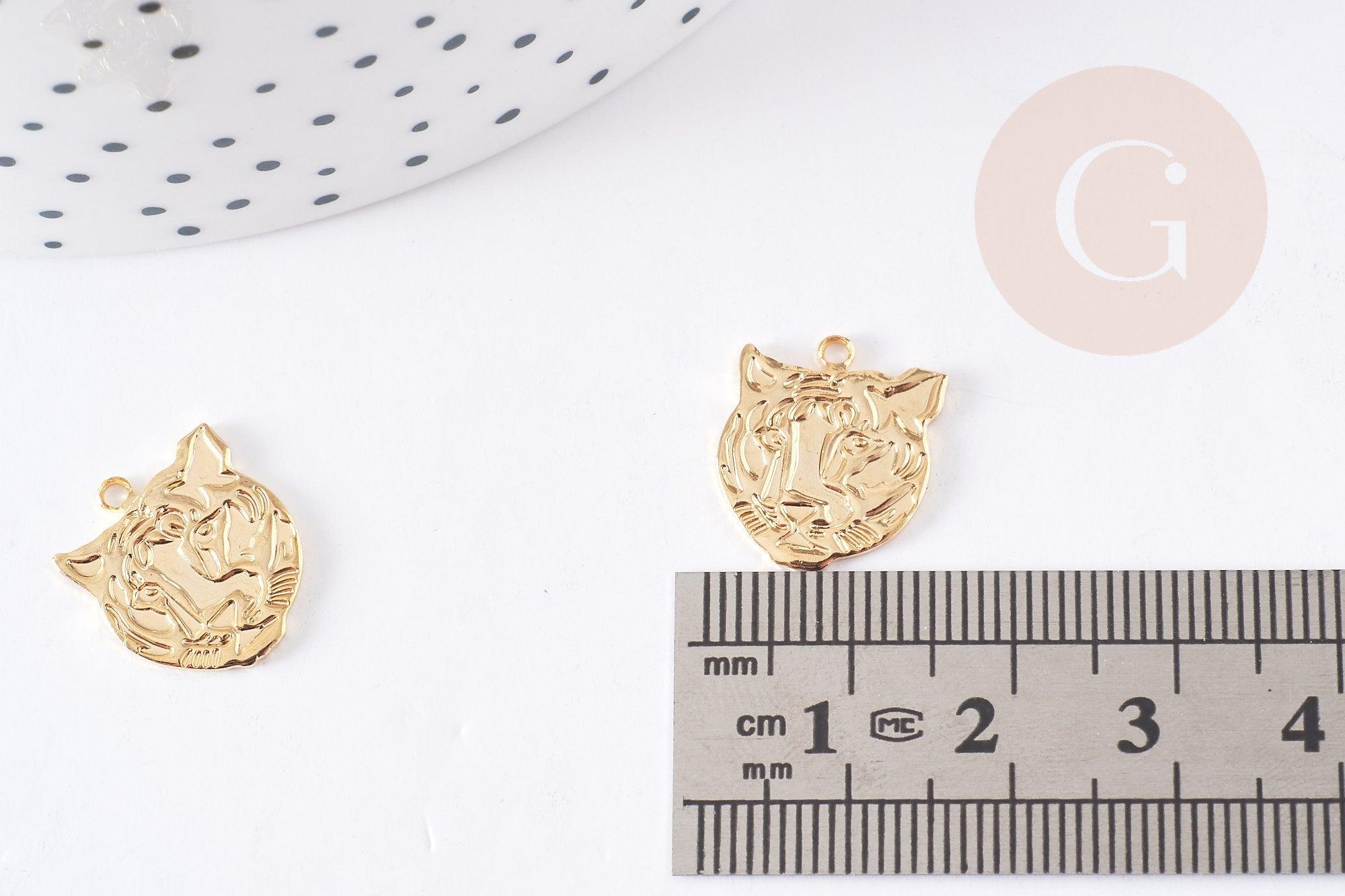 Un colgante de cabeza de tigre en latón dorado , ideal para crear un collar o pendientes sobre el tema de los felinos, la selva, los animales.