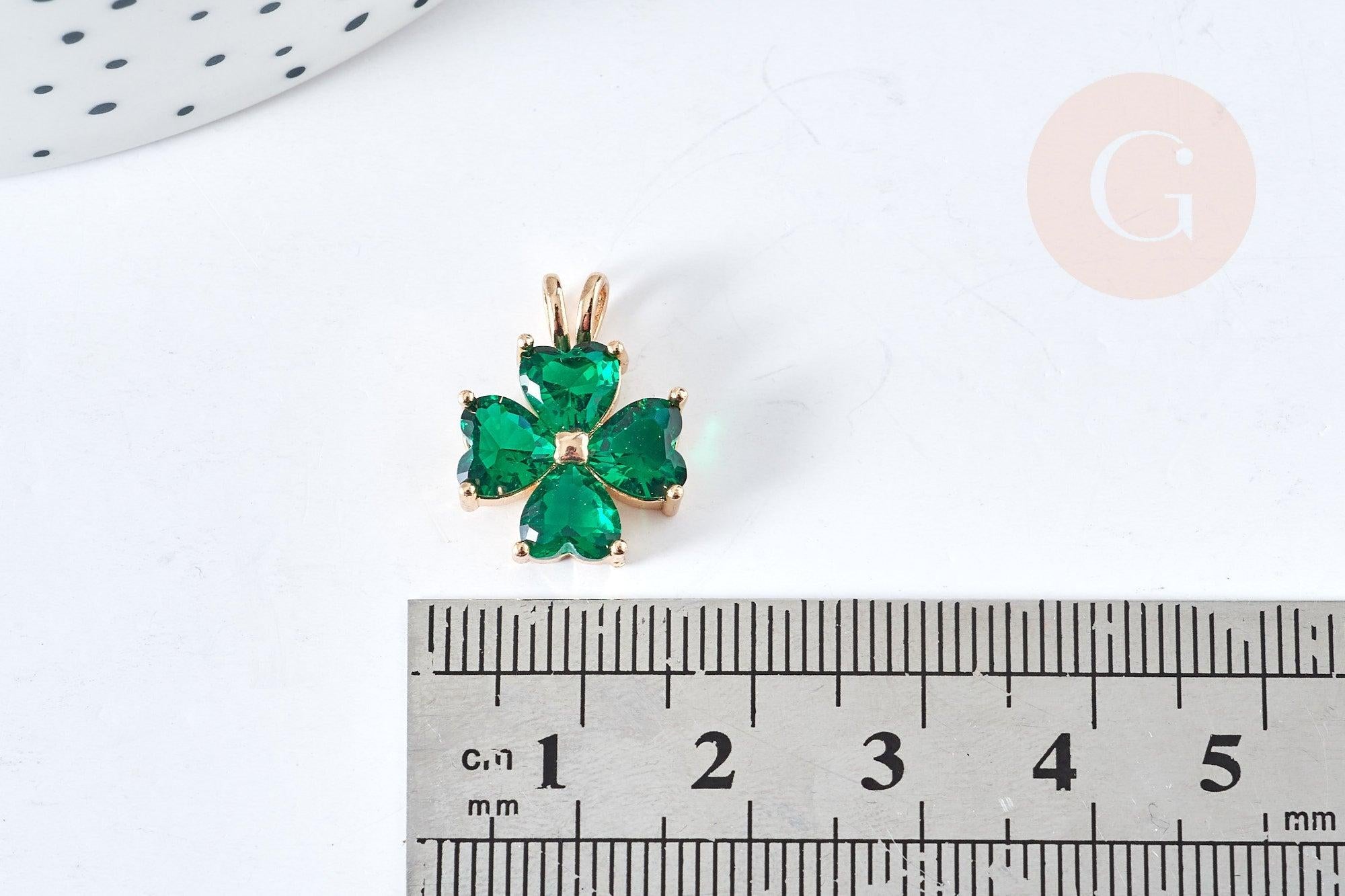 Pendentif trèfle 4 feuilles laiton doré 18K zircons vert 18.5mm, x1 (G8403)