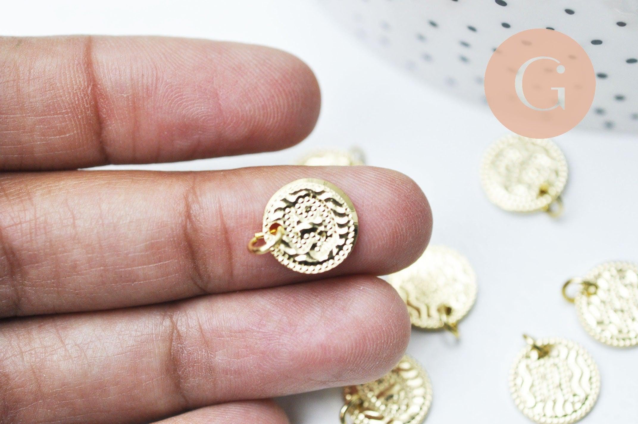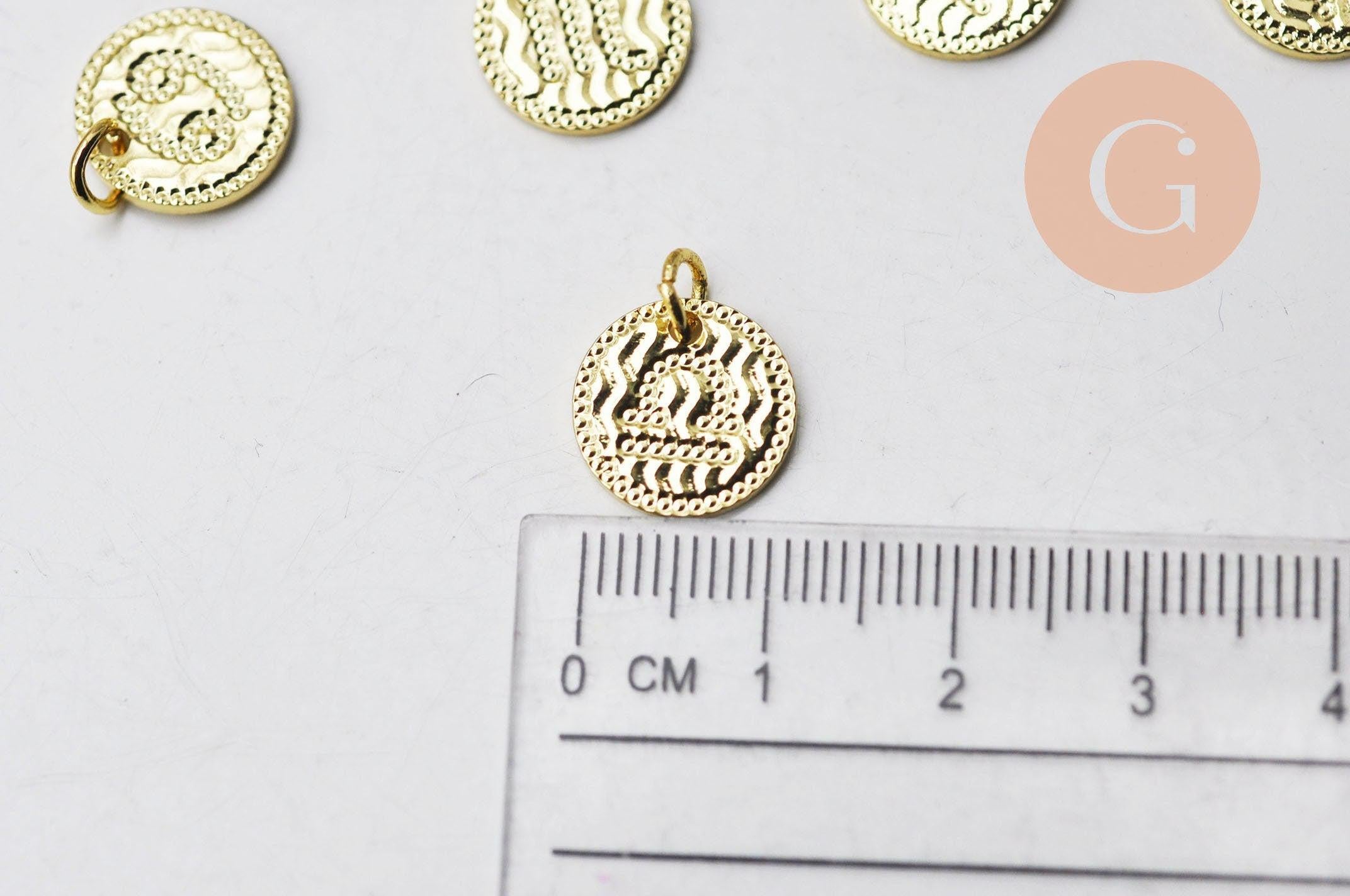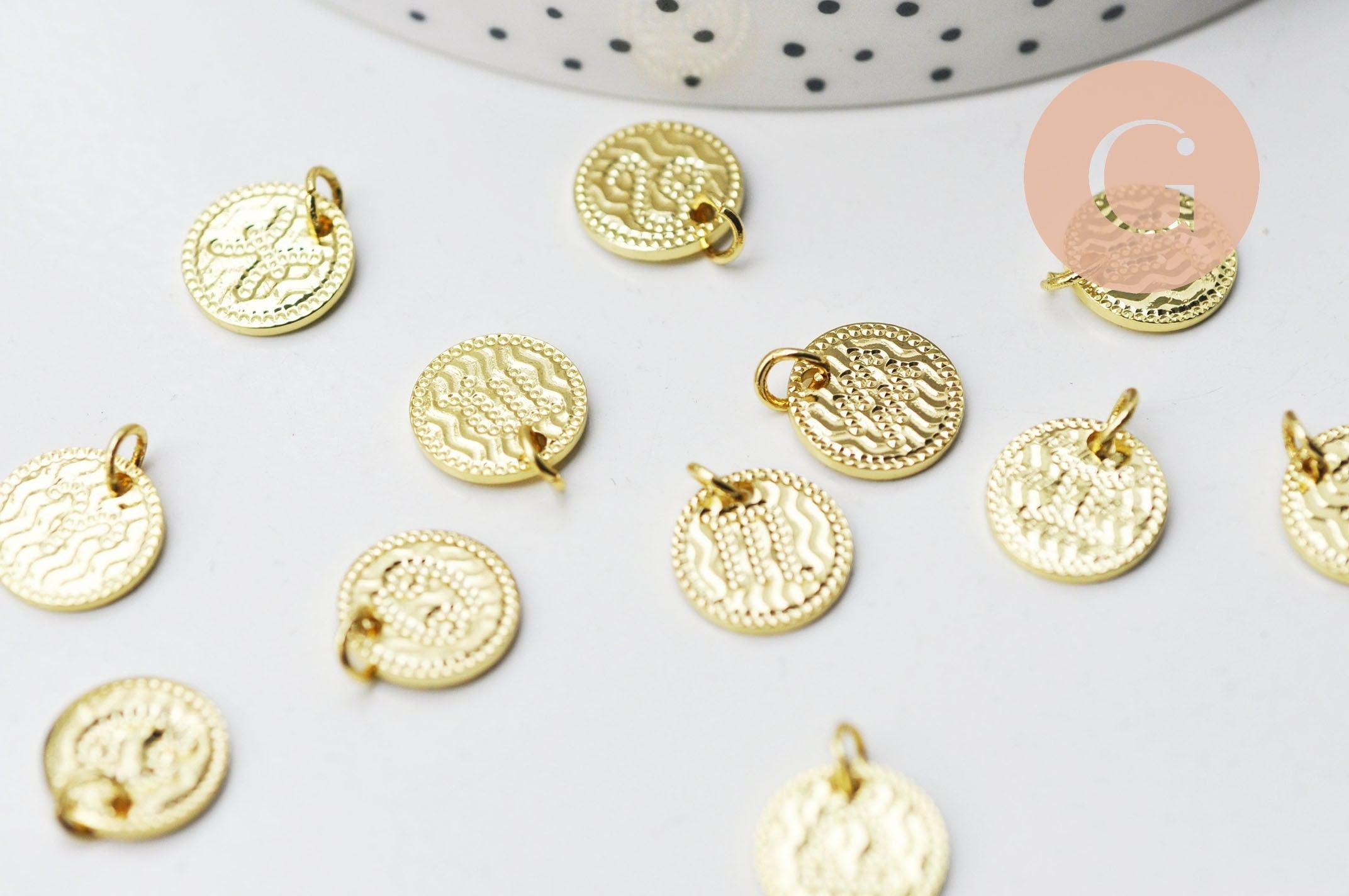 Un pequeño colgante redondo sobre los signos del zodiaco en latón dorado, un accesorio para tener siempre en tu caja de herramientas para realizar todas las joyas.