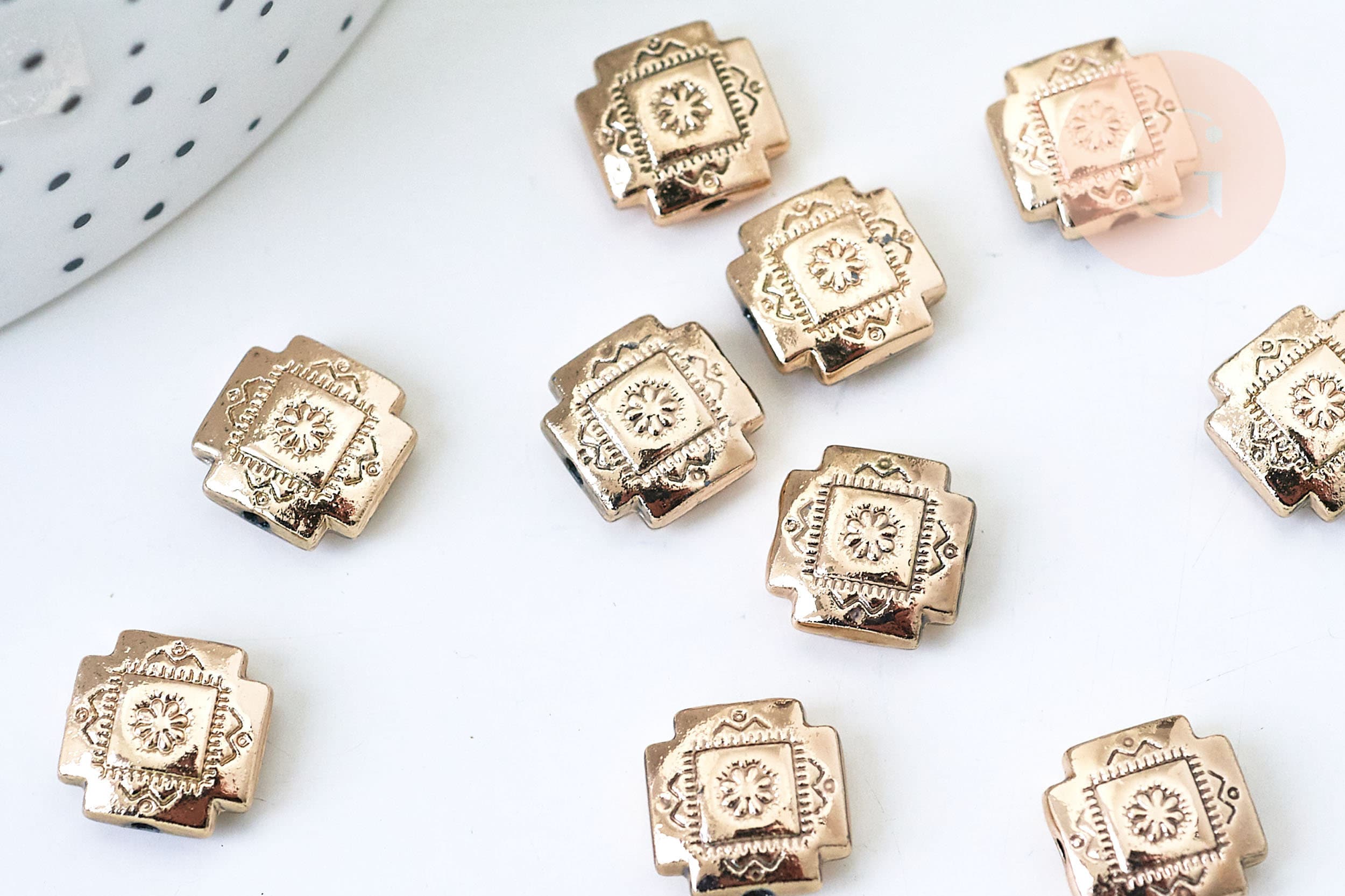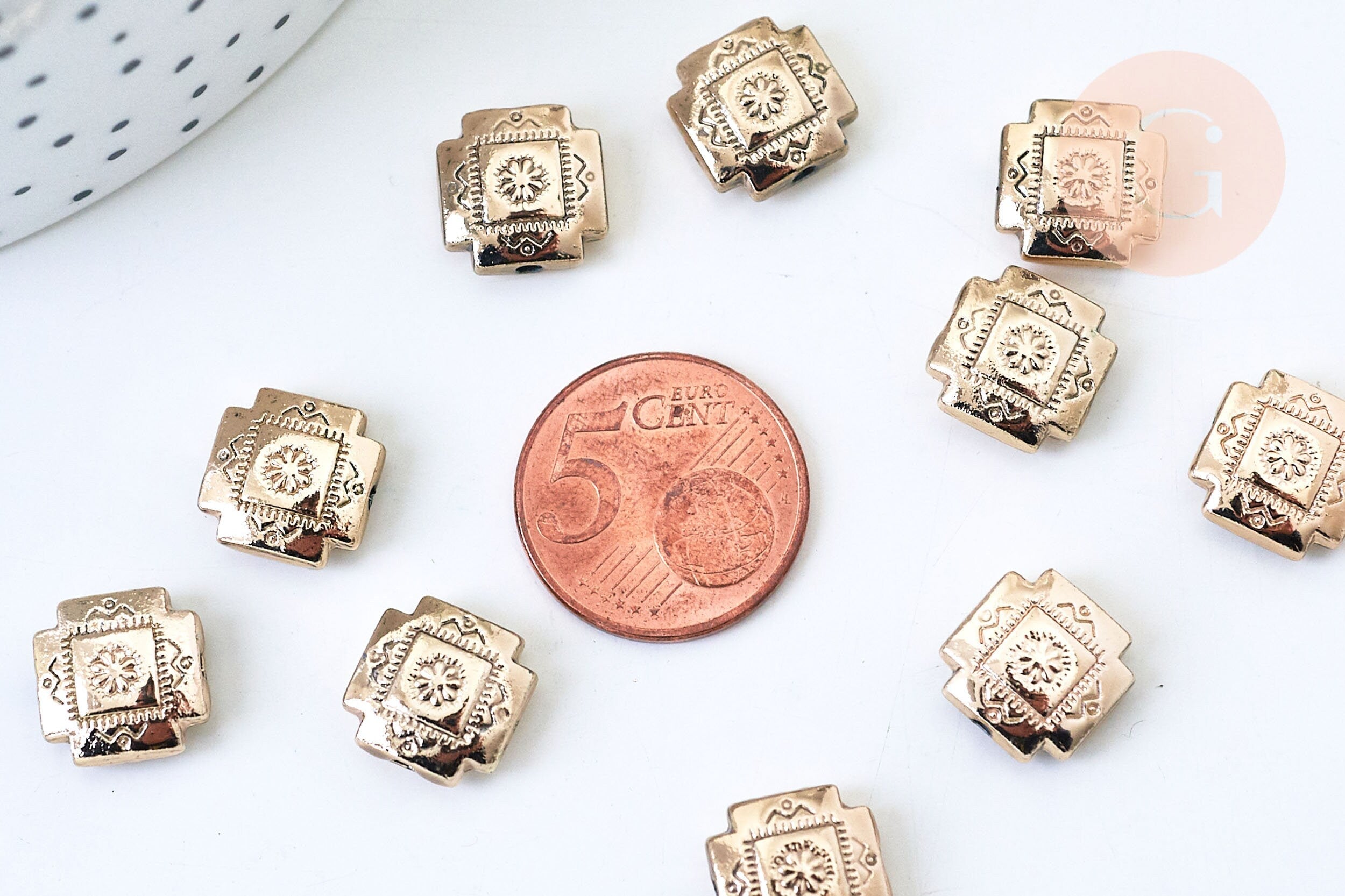 Adopte inmediatamente estas adorables cuentas cuadradas de zamac dorado para crear sus pequeñas joyas de la suerte: ideales para crear pendientes, pulseras y collares. Están grabadas con una flor y un patrón alrededor del contorno de la perla. ¿Y por...