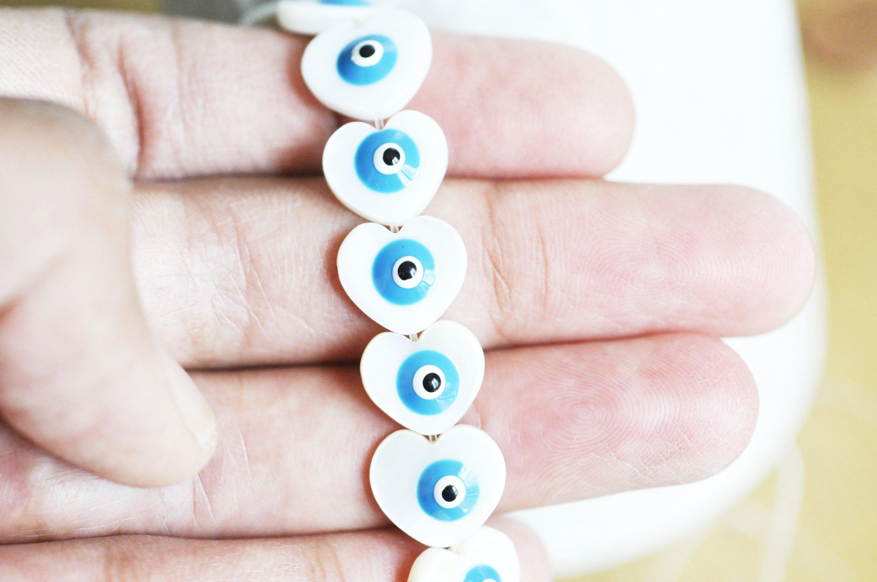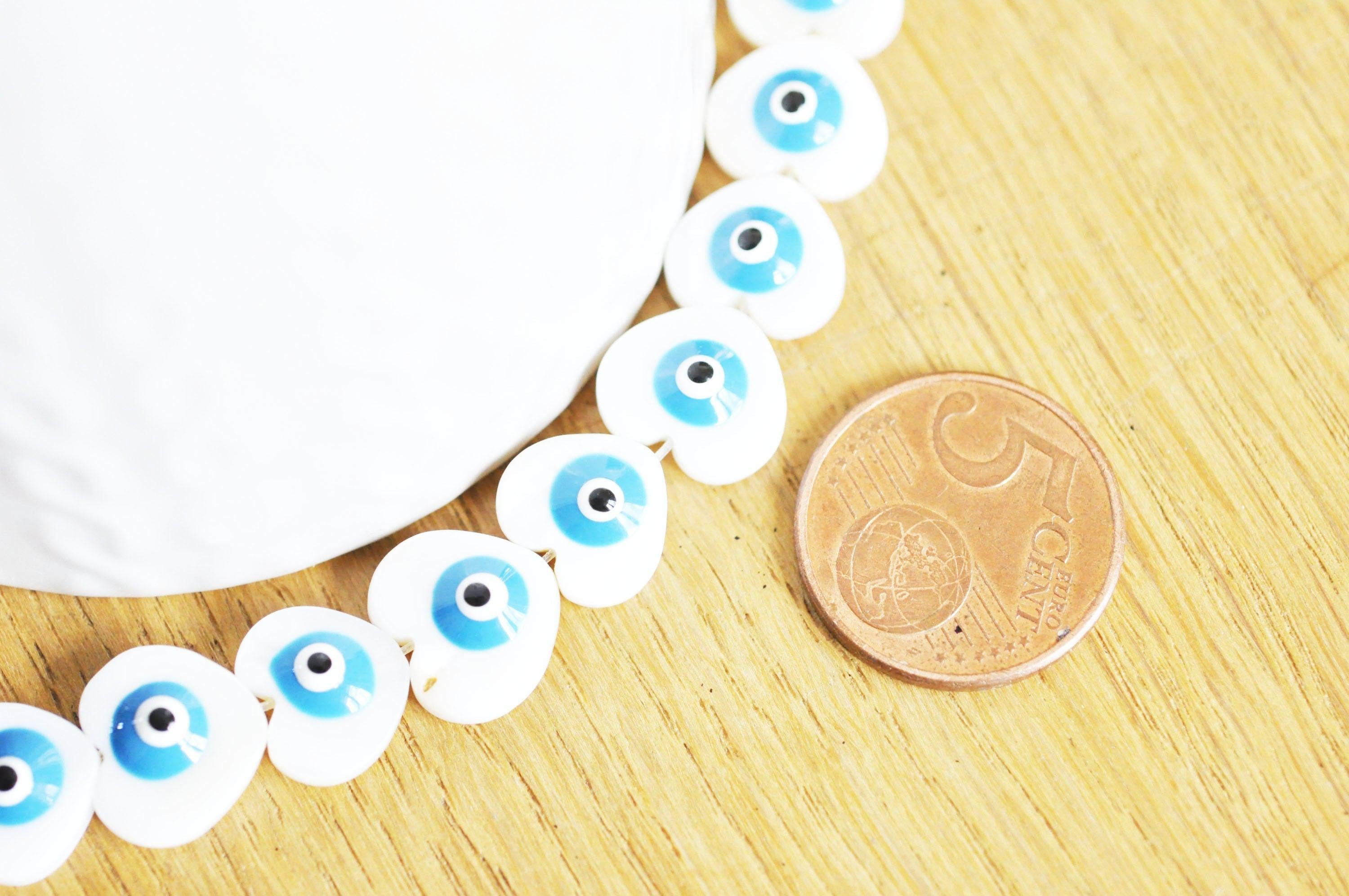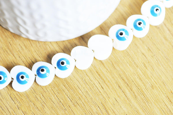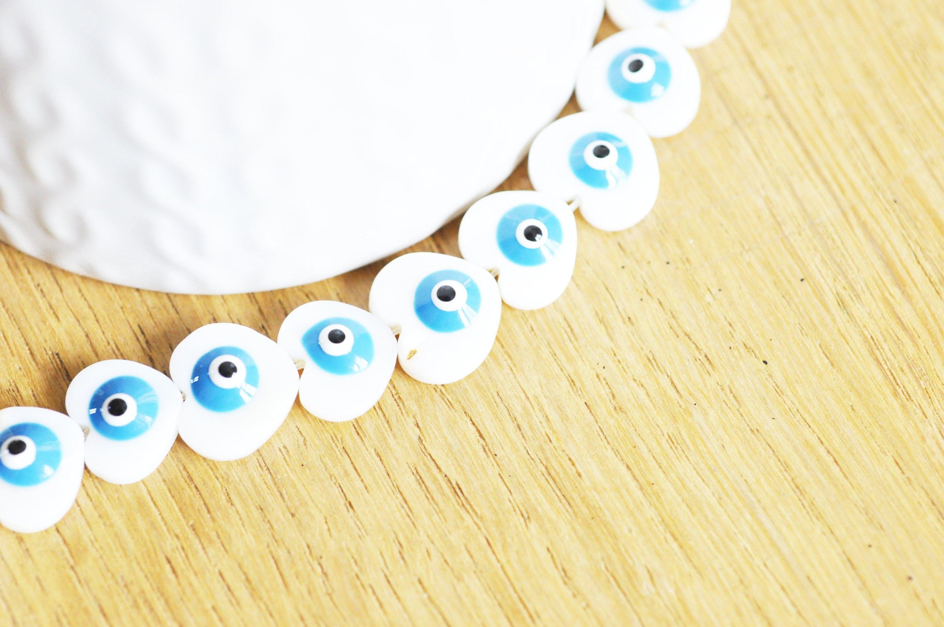Para personalizar sus joyas y otros accesorios textiles o de piel suave, opte por este juego de 10 cuentas de corazón de nácar blanco que representan el ojo de la suerte.