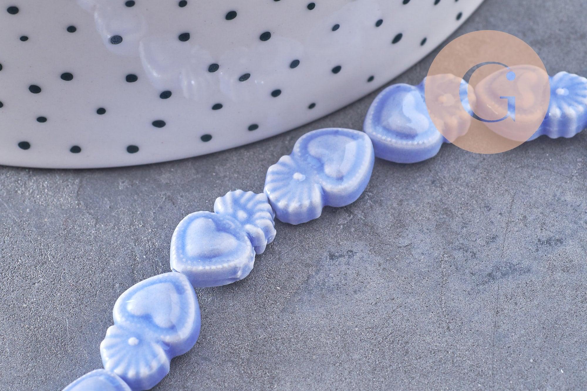 Un juego de cuentas de corazón de porcelana esmaltada en azul suave iridiscente.