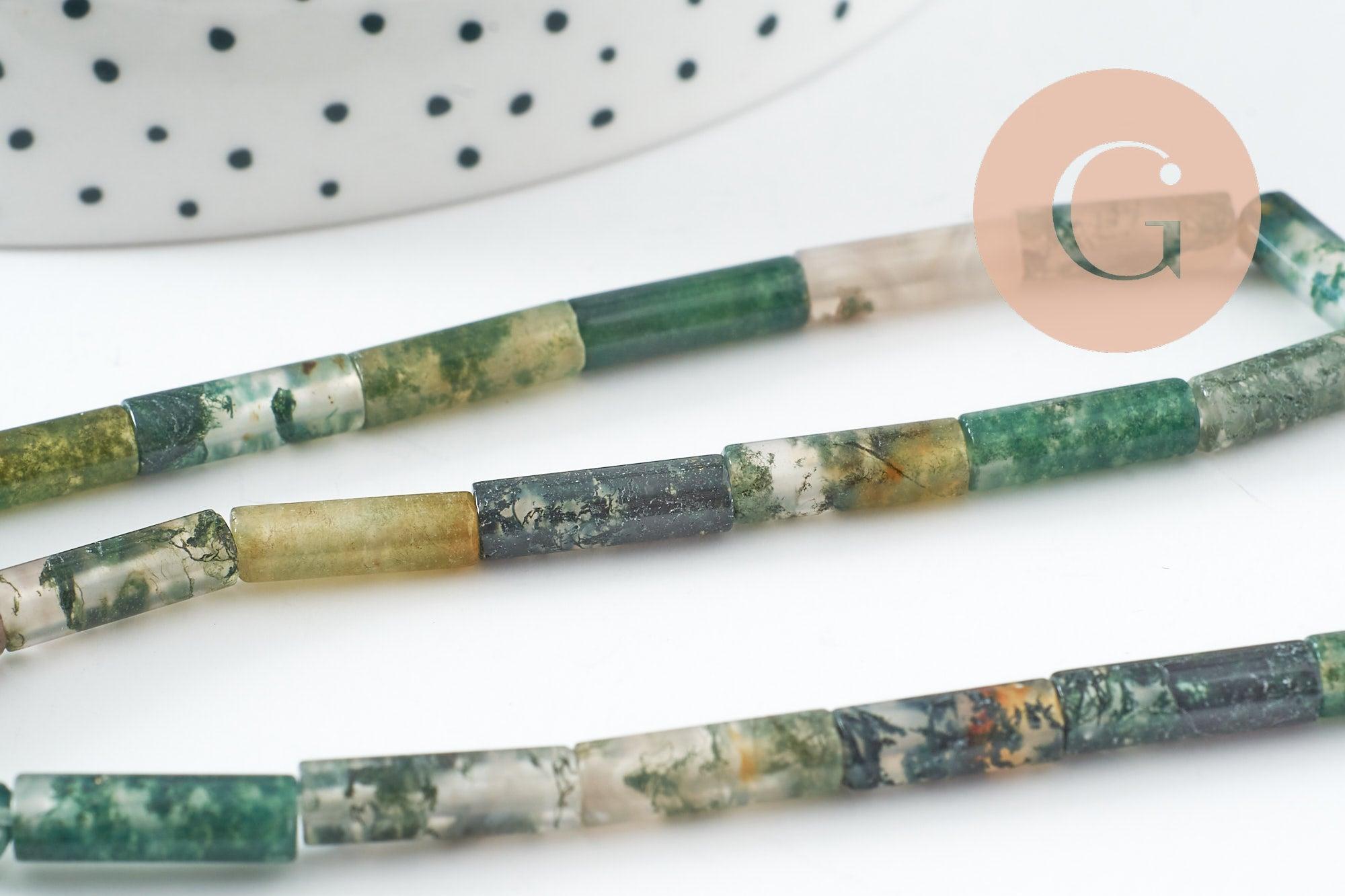 Descubre este magnífico hilo de cuentas de ágata musgosa natural , cortadas en tubos de 13 a 14 mm .
