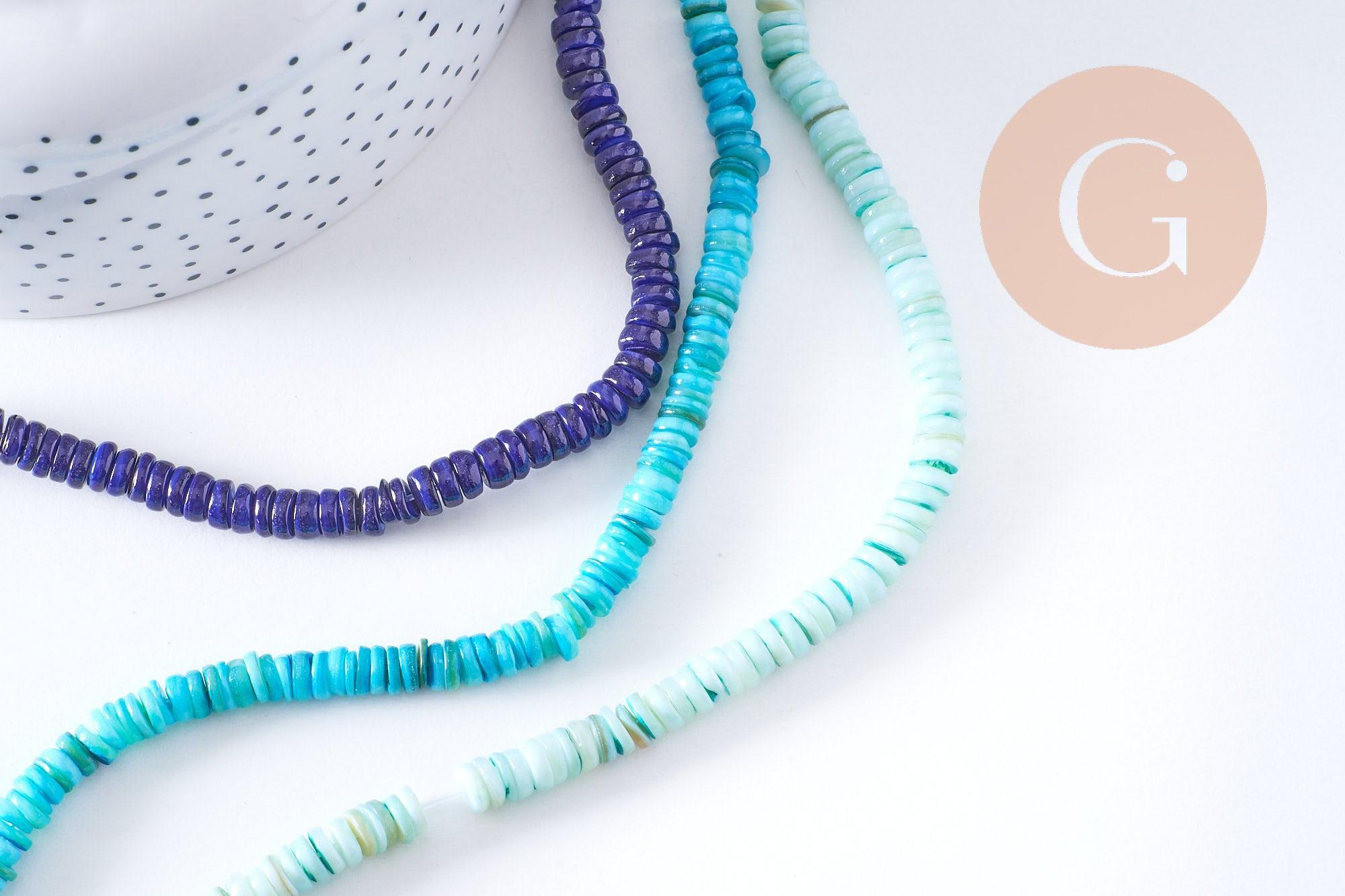 Dale profundidad y un toque marinero chic a tus creaciones con estas cuentas heishi de concha natural teñidas de azul. Su acabado irregular y su intenso tono las convierten en el complemento ideal para joyería elegante y moderna de inspiración marina .