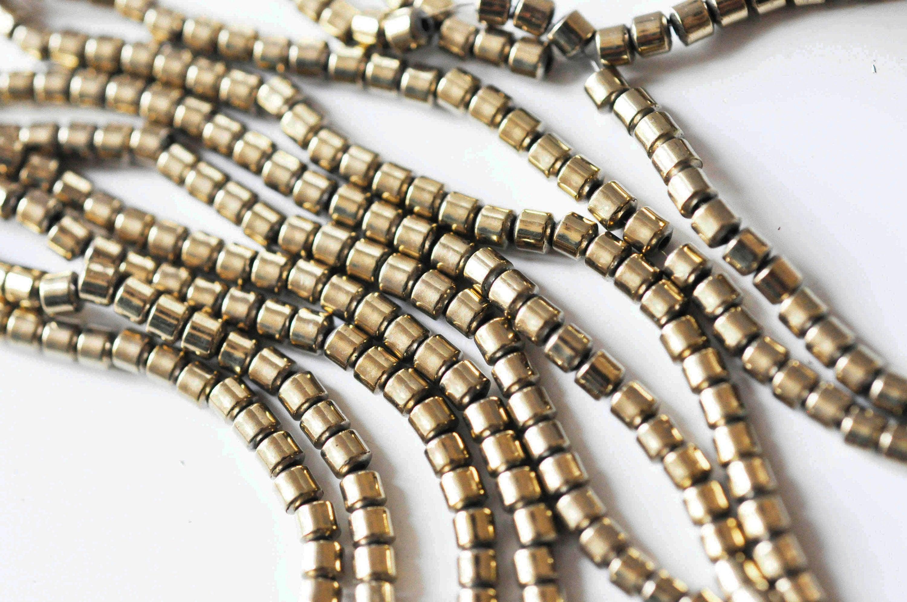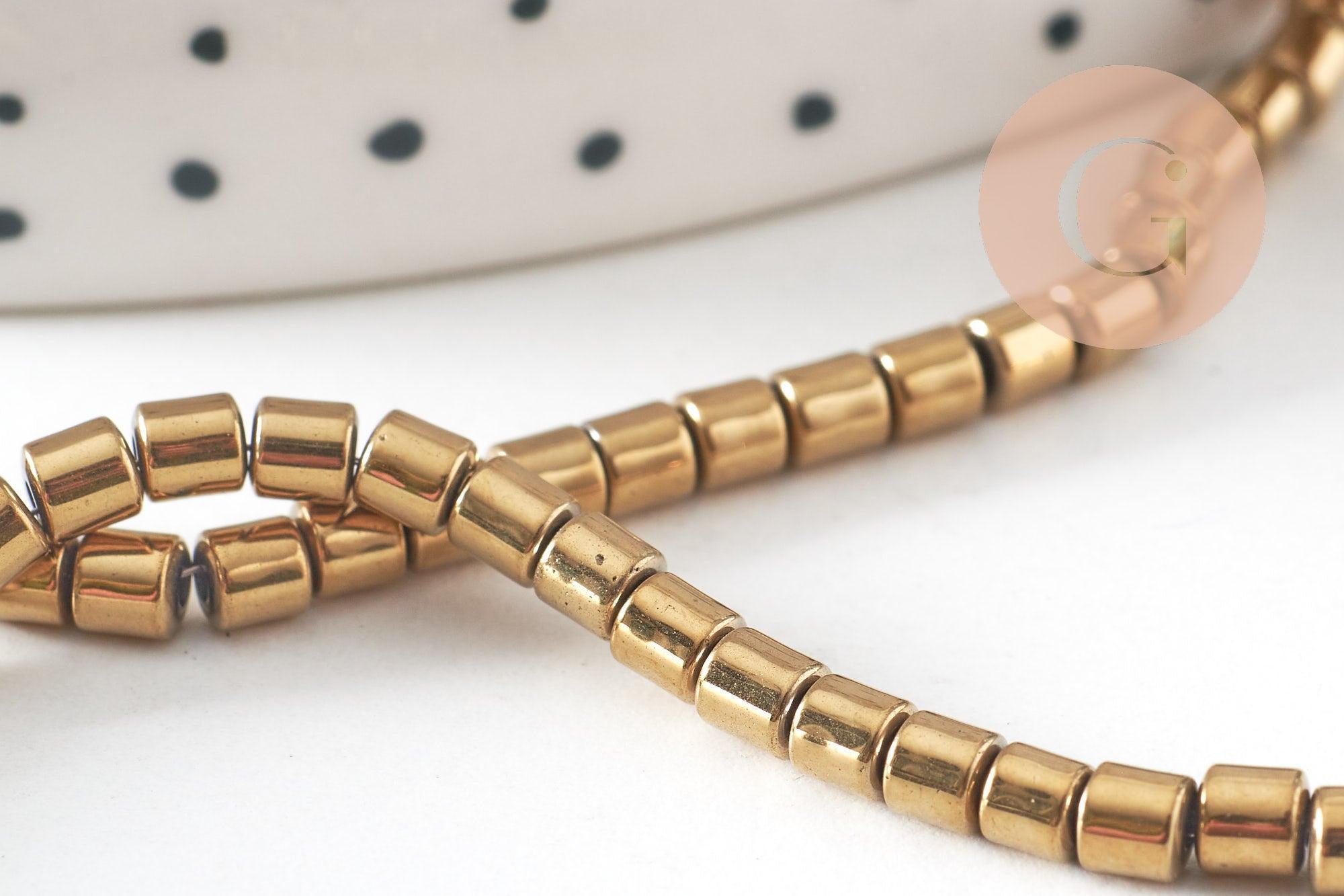 Déjate seducir por estas cuentas de tubo de hematita sintética dorada, una piedra fina con un gran efecto.
