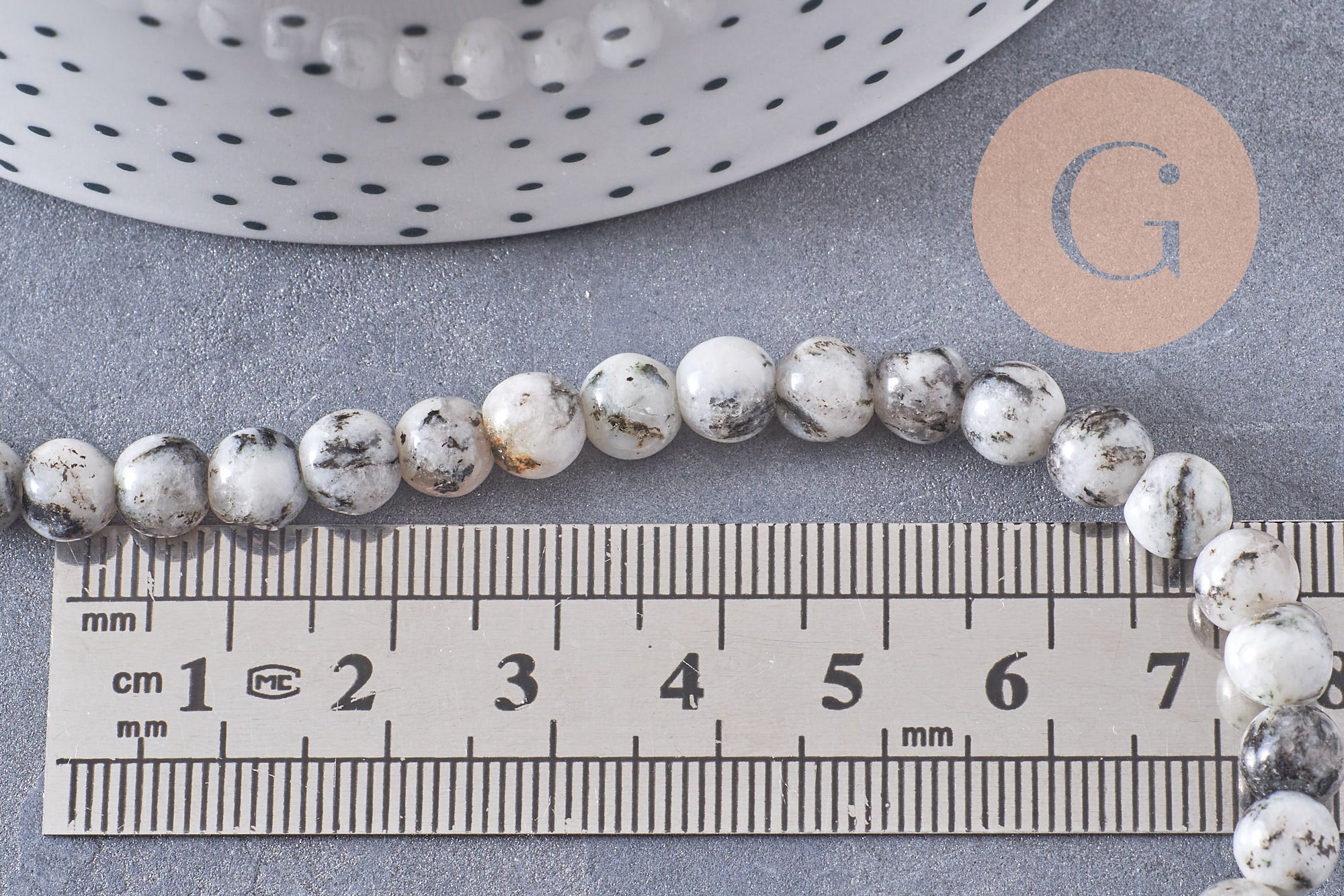 El hilo de aproximadamente 60 cuentas en jaspe cebra natural gris y blanco. Son magníficos por su tamaño, perfectos para hacer un collar original, completar un colgante o incluso una pulsera y pendientes.