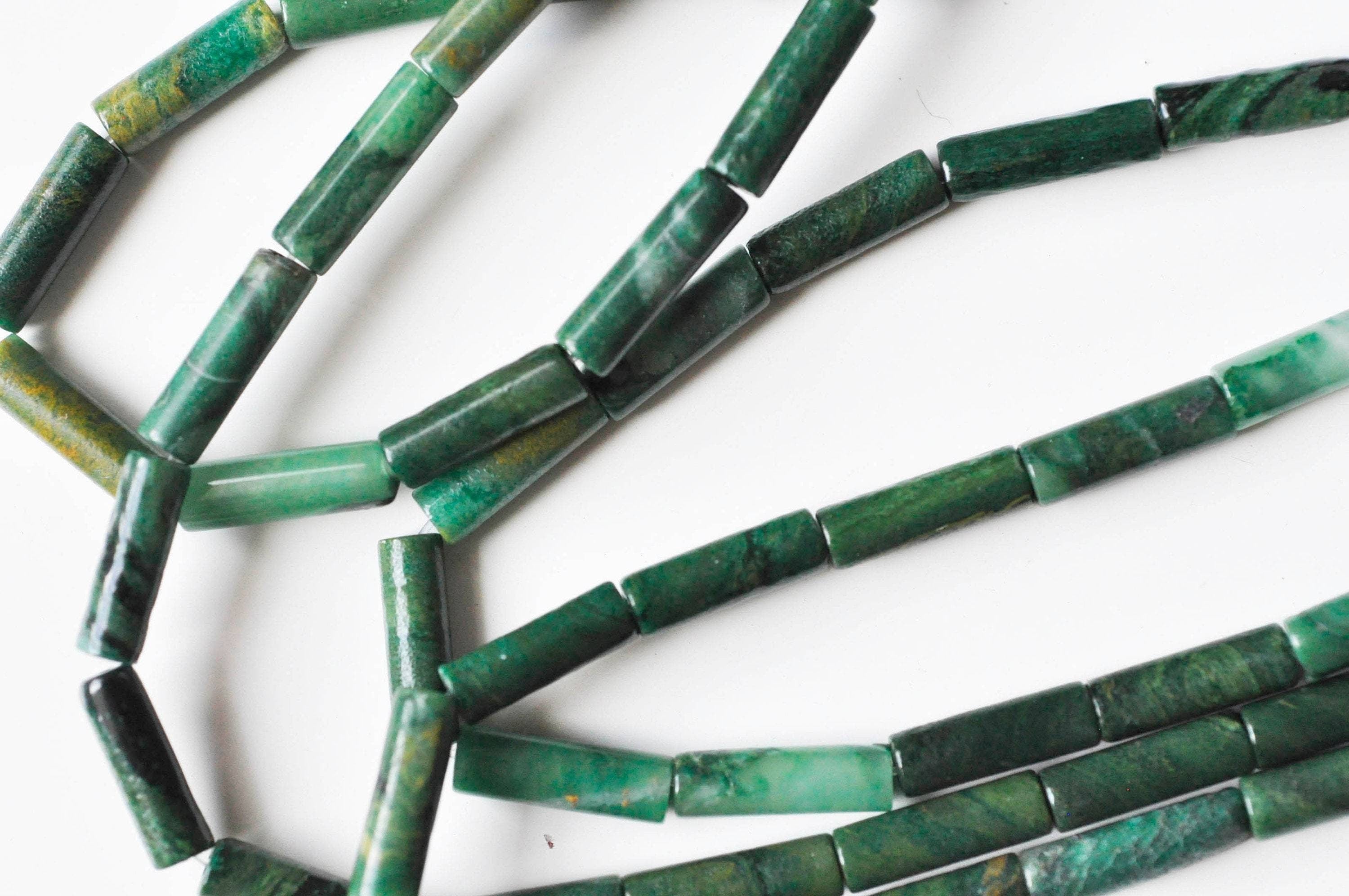 Dale un toque de autenticidad a tu bisutería con estas cuentas tubulares de jade africano verde natural . Cada cuenta es única, con sutiles variaciones de tono que van del verde intenso al verde oliva, revelando todo el encanto natural de esta fina piedra. Sin teñir, conservan su brillo natural y su energía mineral.