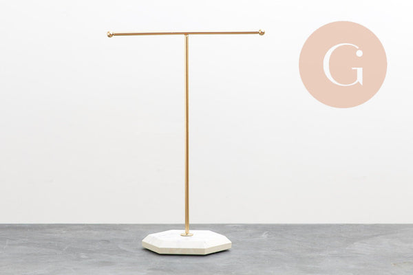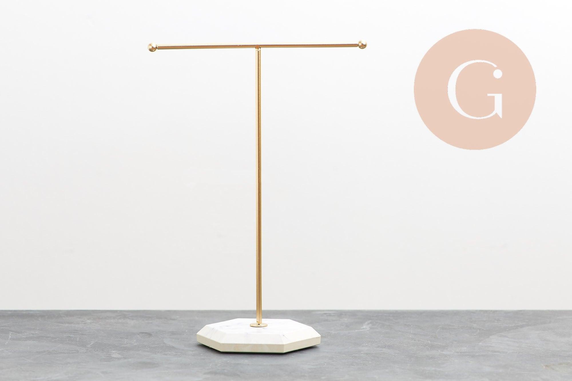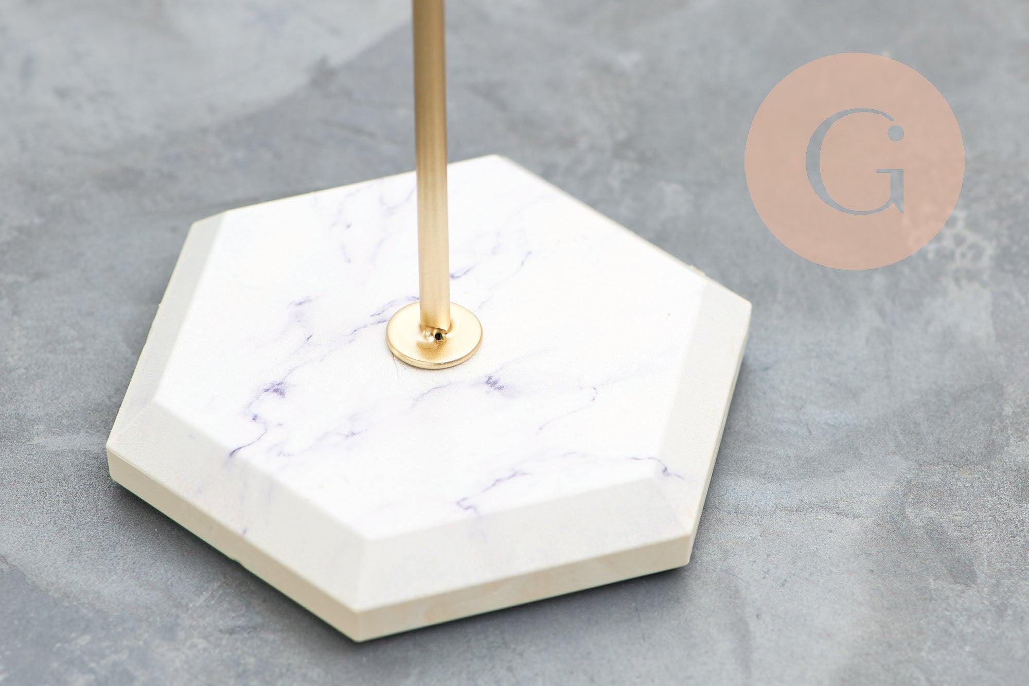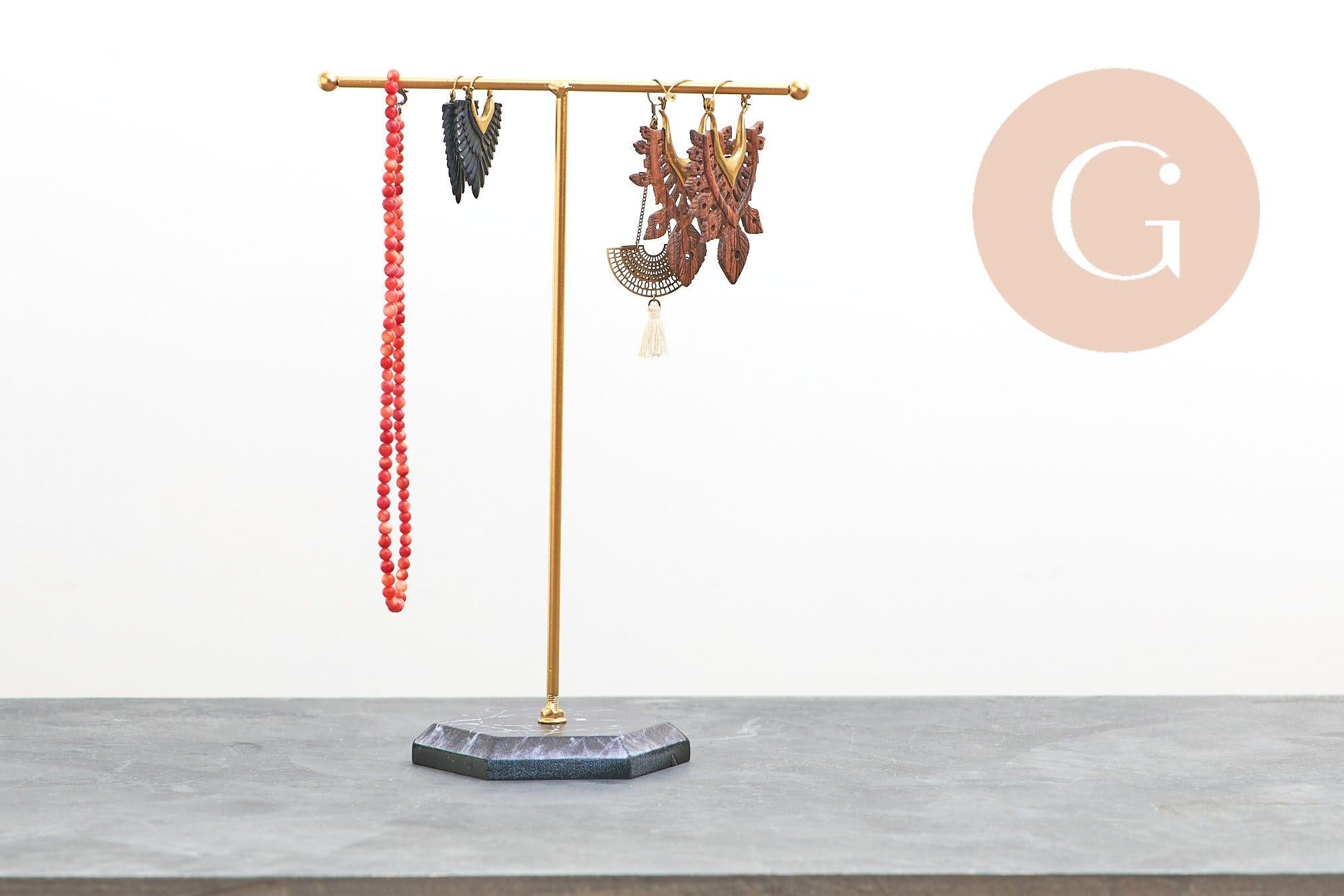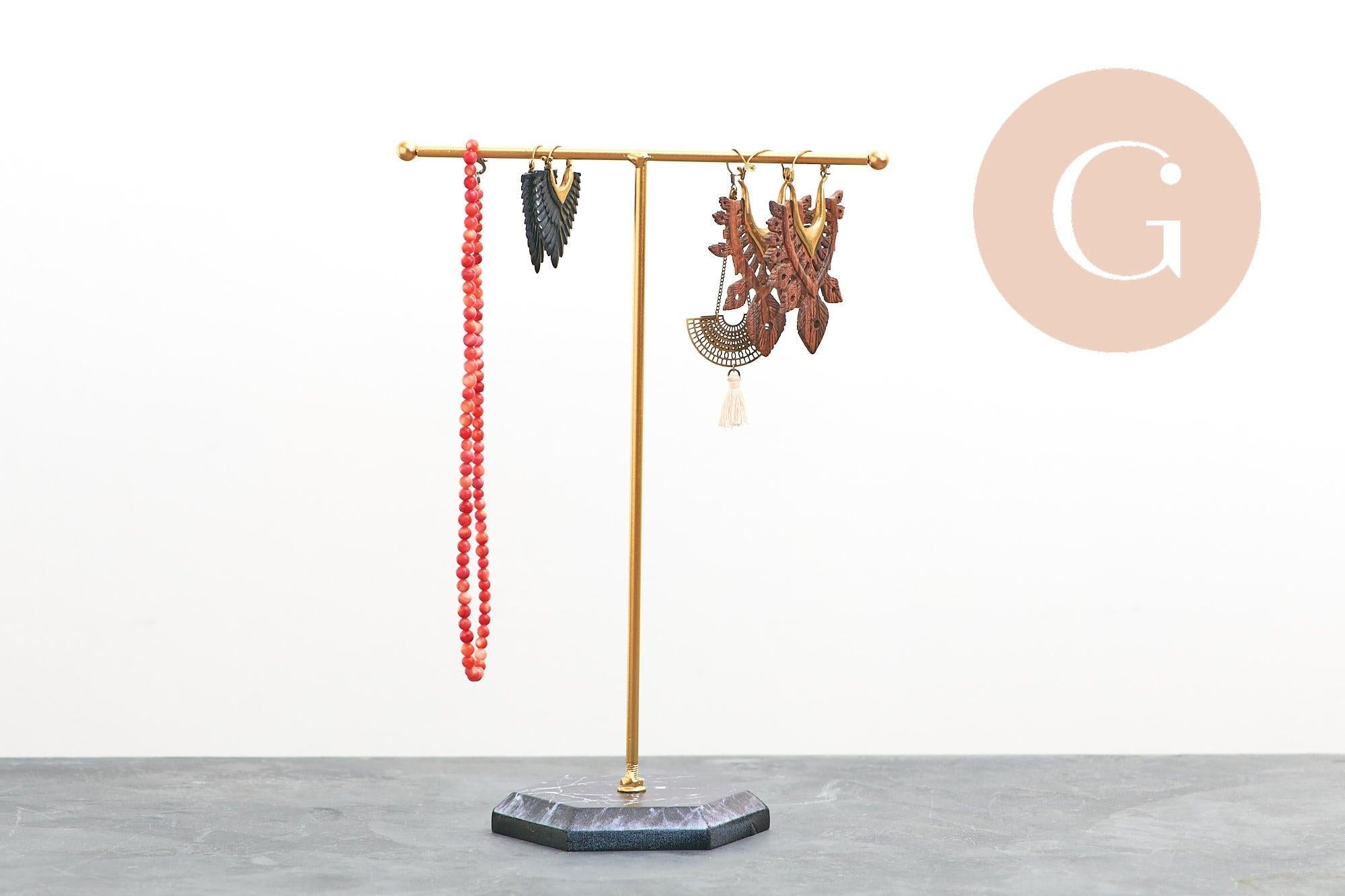 Muestra tus pendientes con elegancia gracias a este expositor de joyas en metal dorado y base de madera pintada imitación mármol blanco o negro.