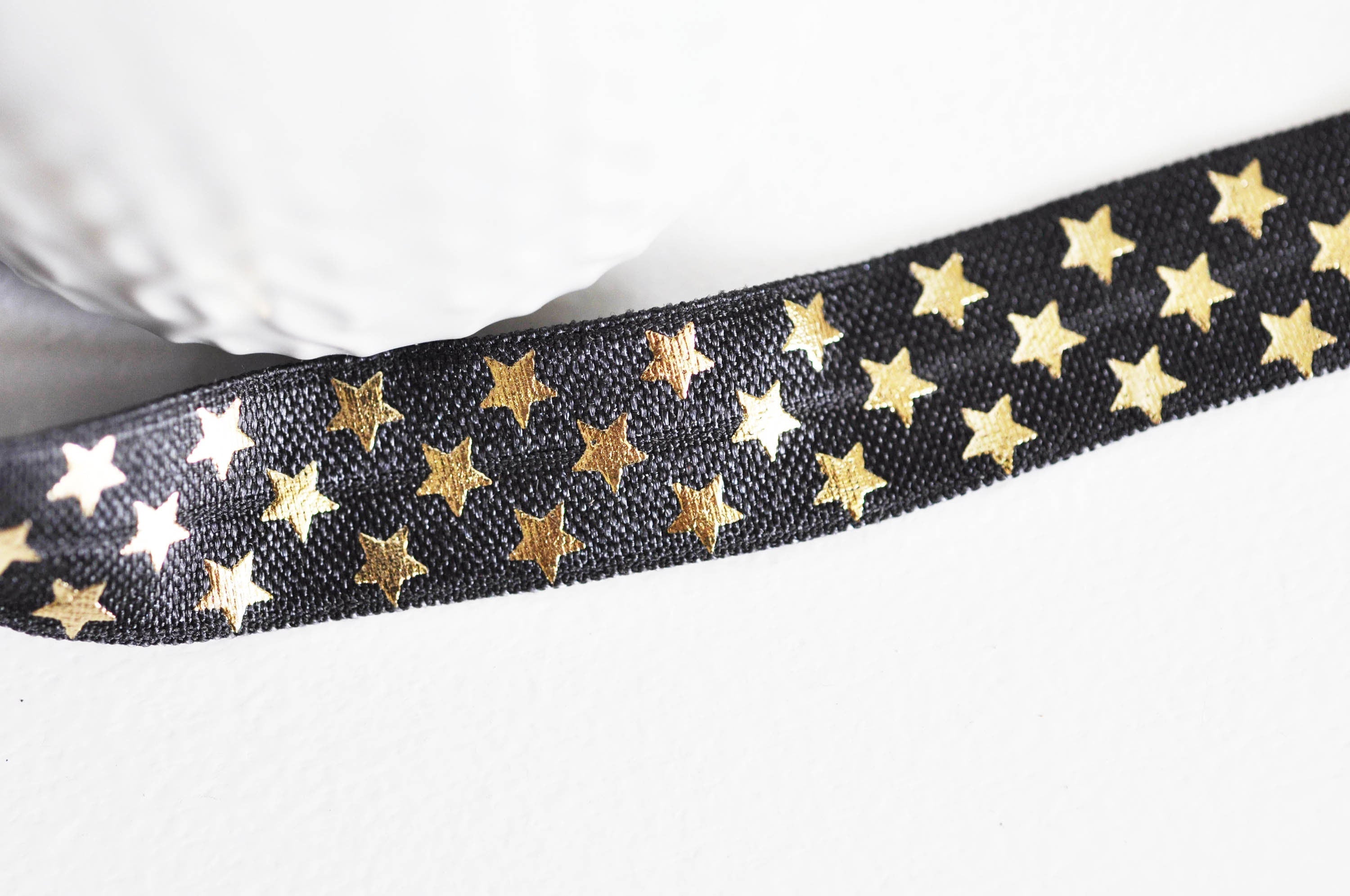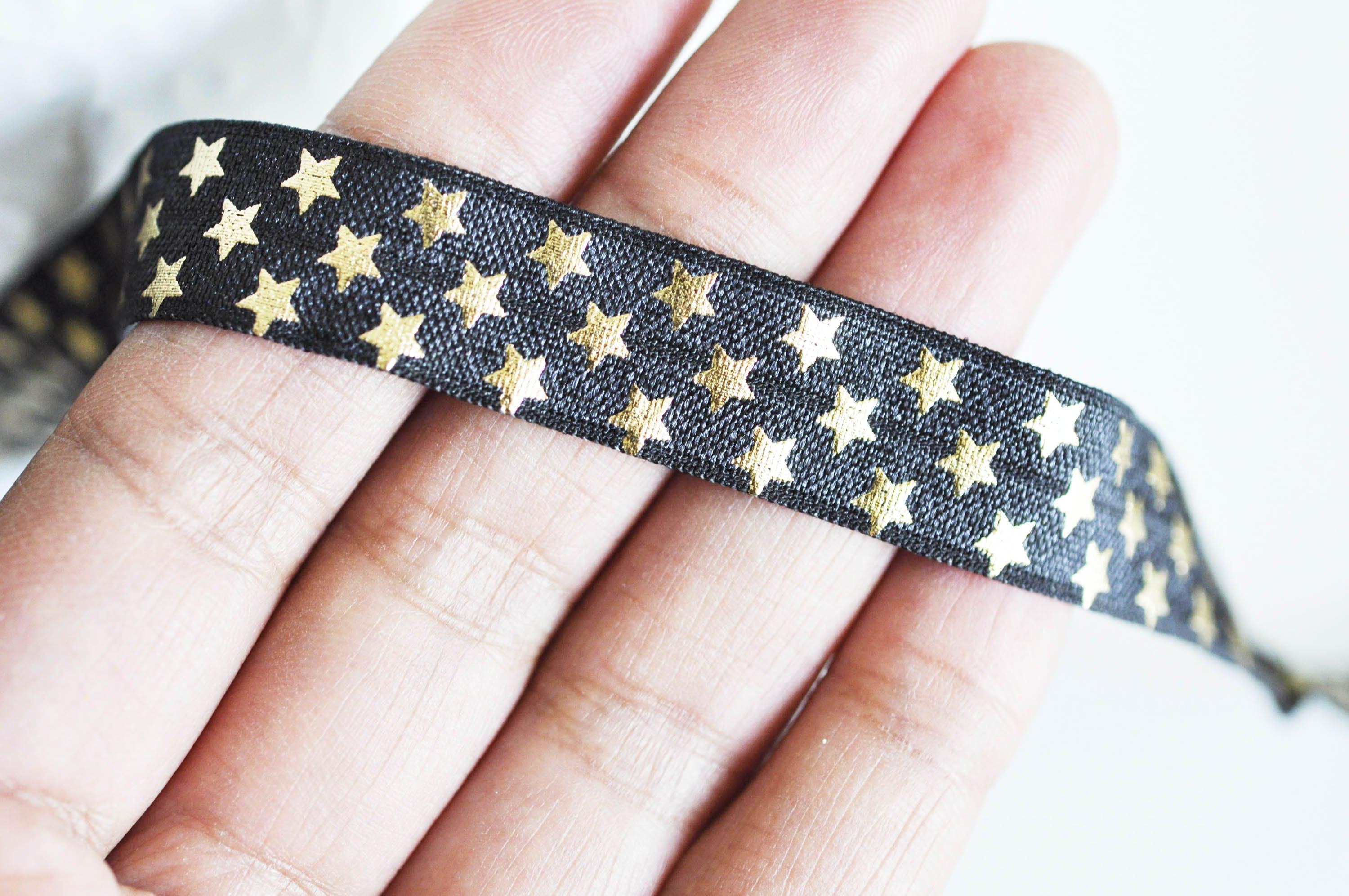 Esta cinta elástica plana y ancha con estampado de estrellas será ideal para creaciones de costura DIY, personalización, ropa, así como para la creación de bisutería... Te encantará esta cinta elástica ancha con estampado dorado sobre fondo negro. ¿Cómo utilizar...