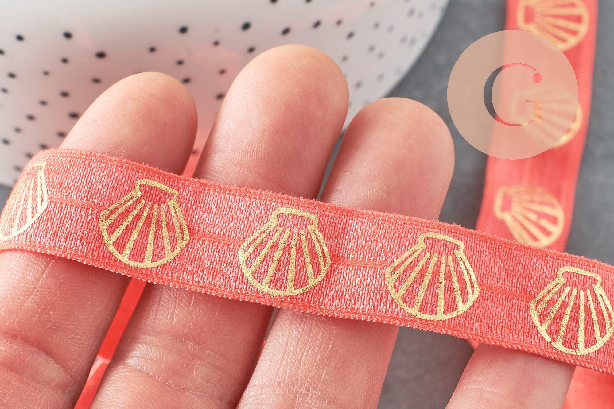 Te encantará esta cinta elástica ancha con estampado dorado sobre fondo naranja coral.