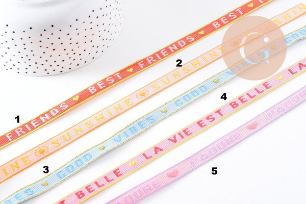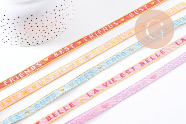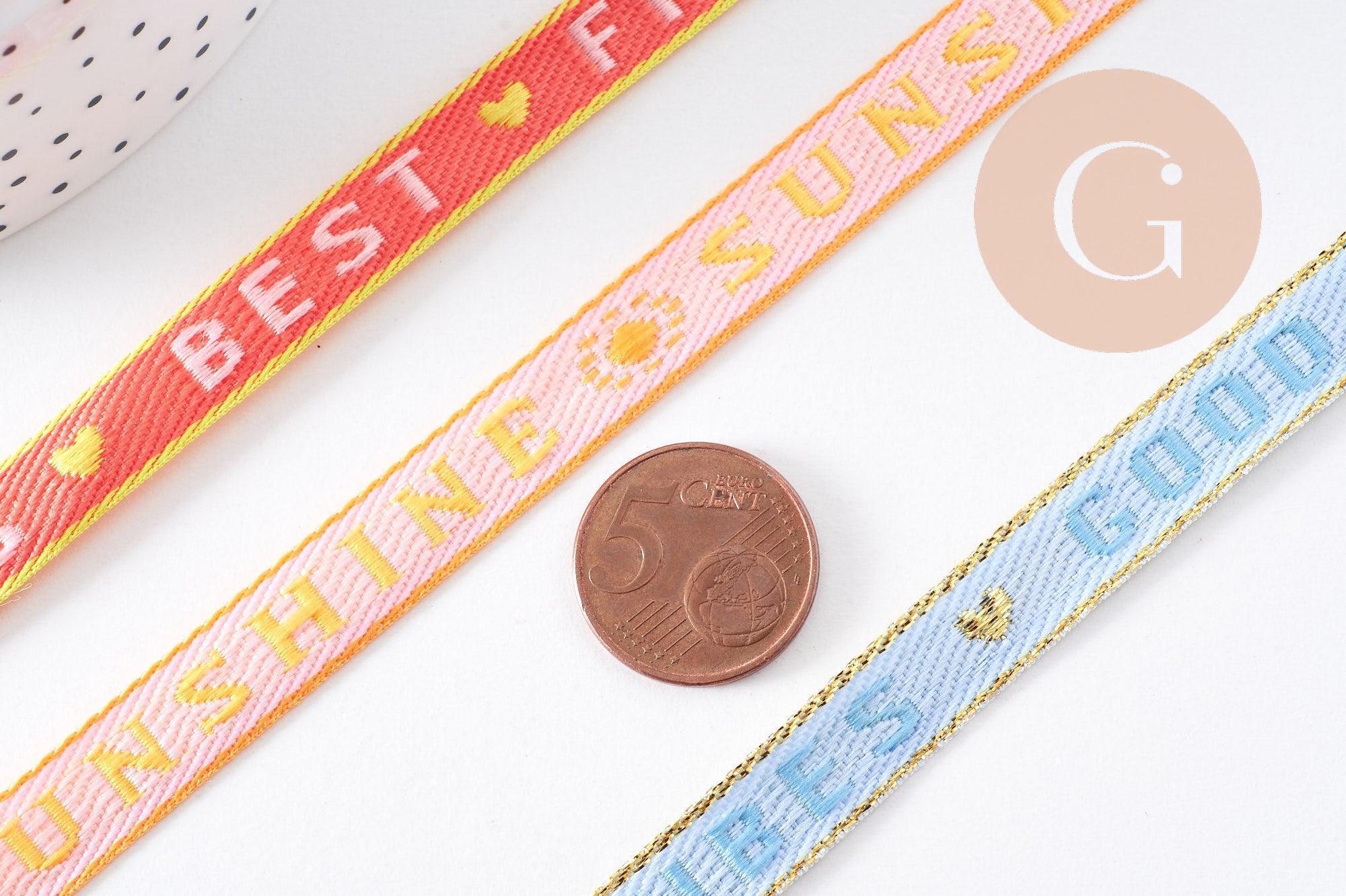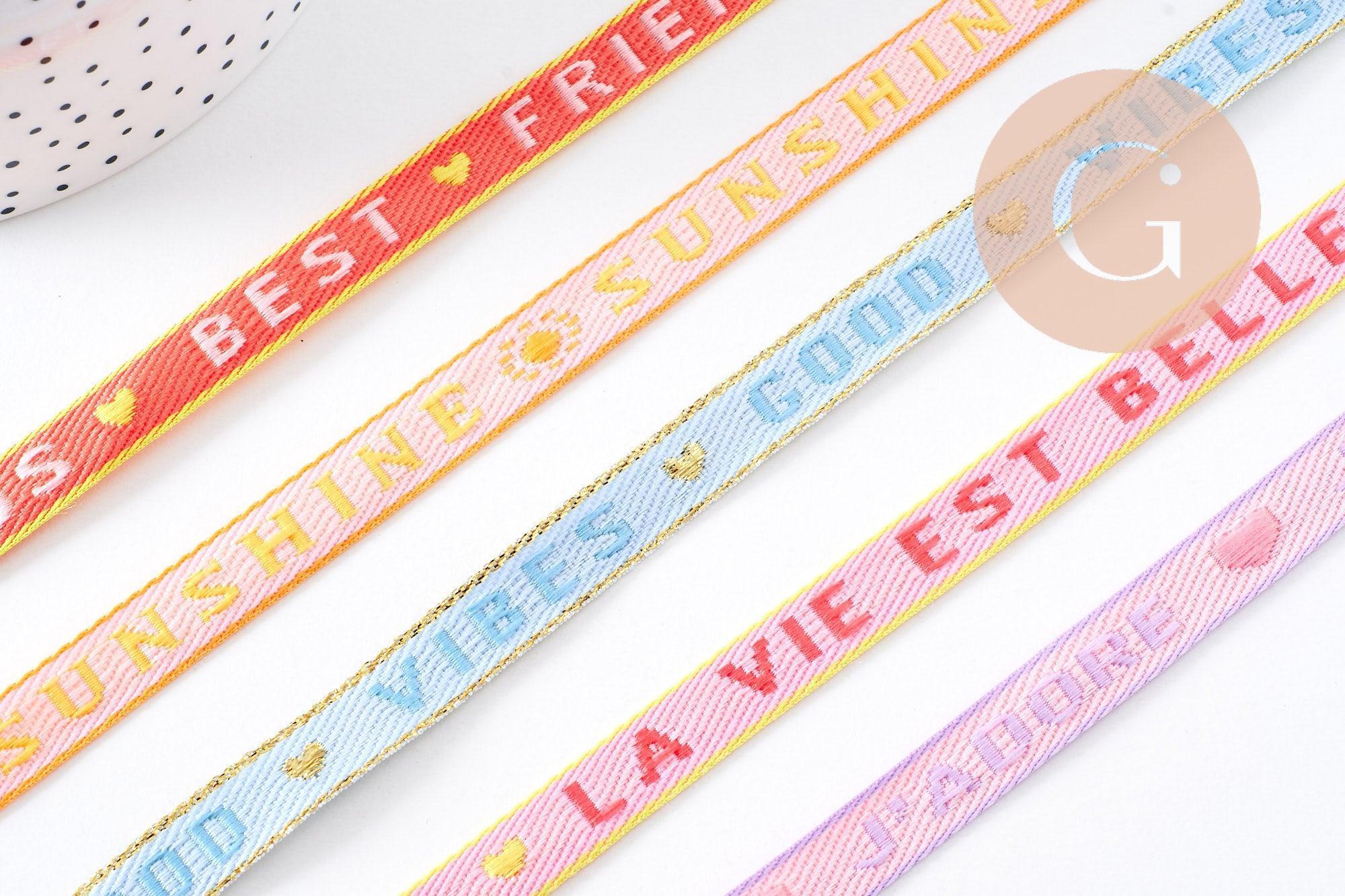Dale un toque romántico y elegante a tus creaciones con esta cinta bordada "Amor" de 10 mm . Disponible en varios colores con textos como "Mejores amigos", "La vida es bella", "Buenas vibras", "Sol" y "Te amo".